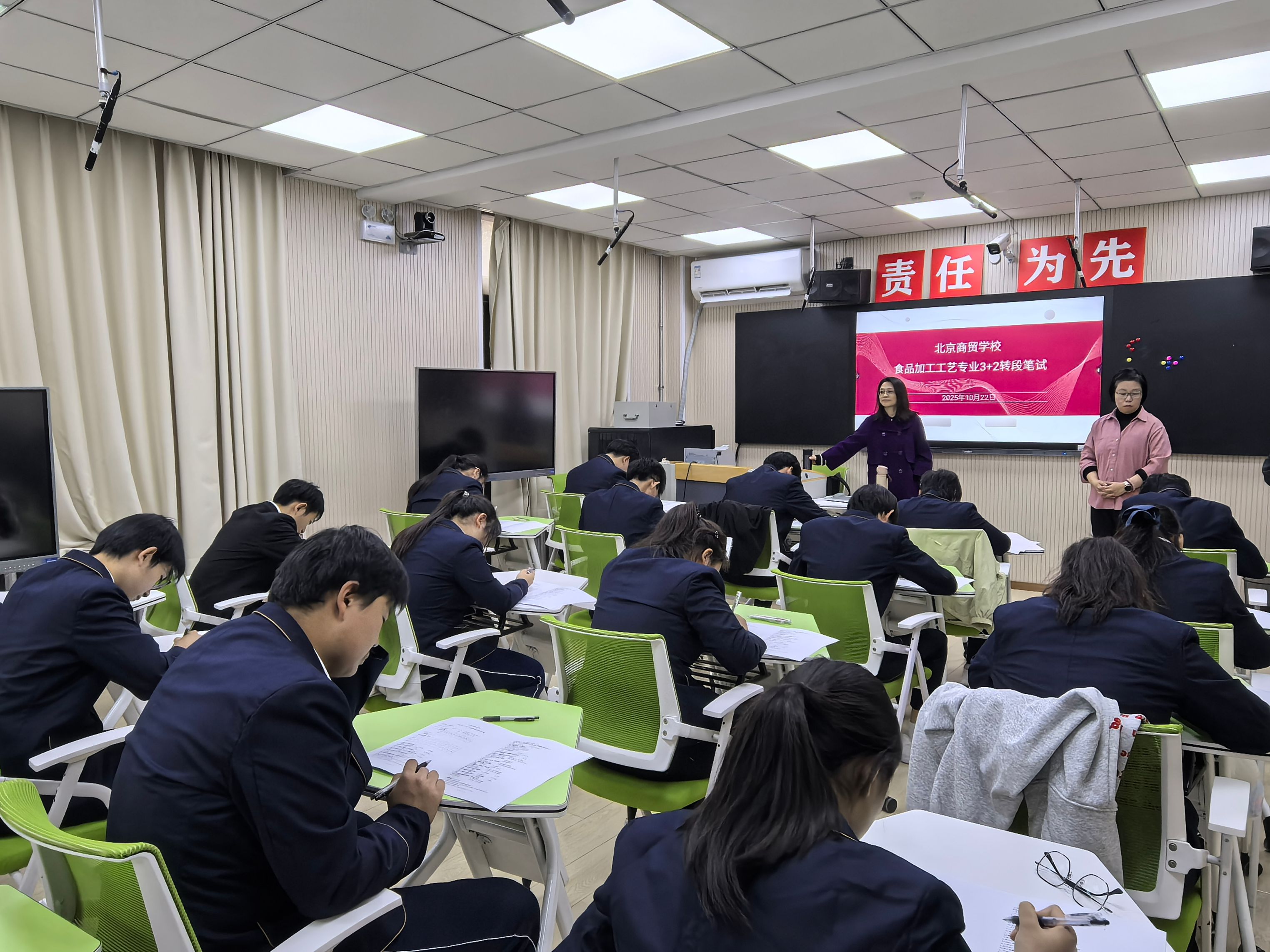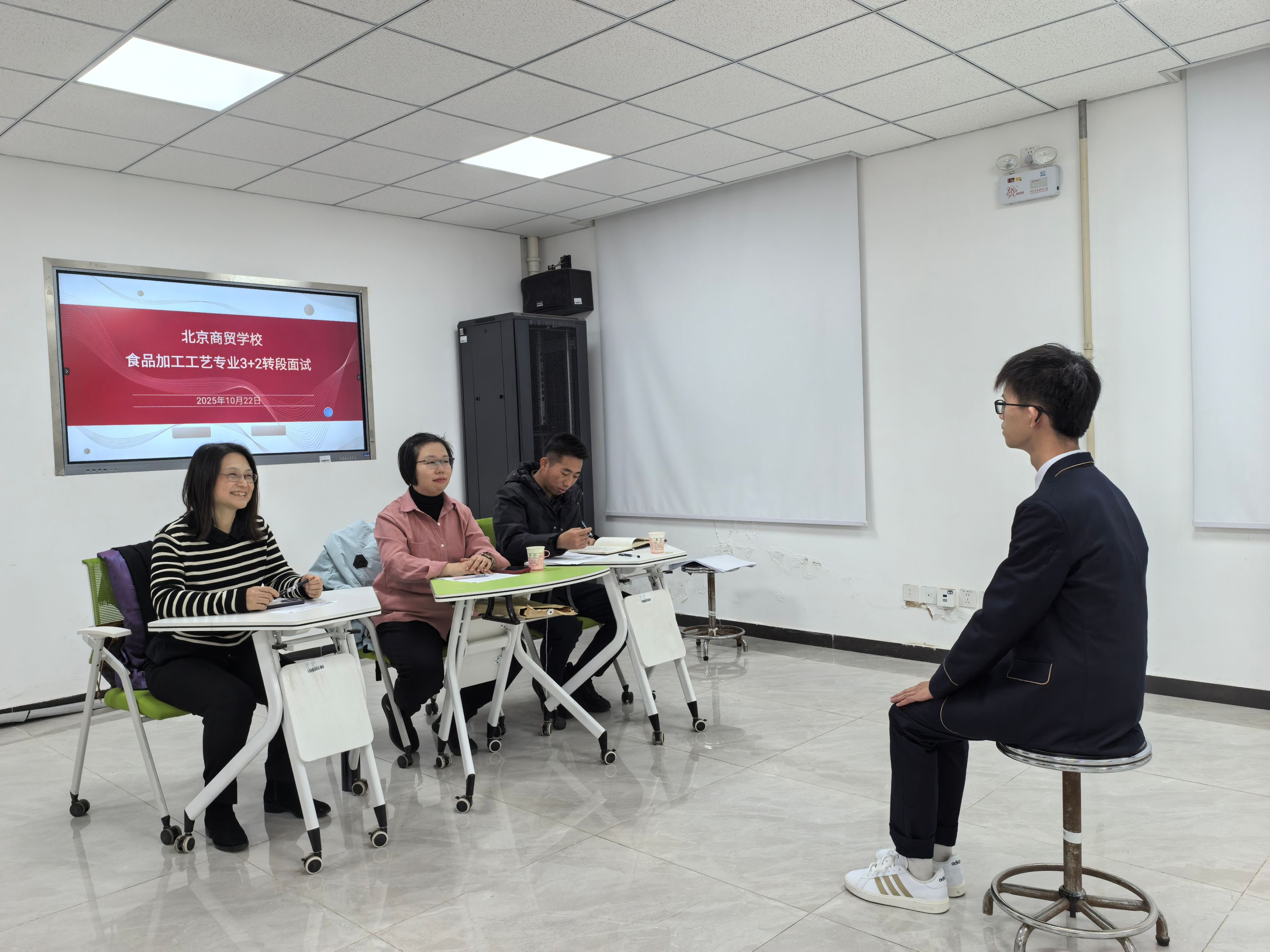 根据《生物工程学院2025年“3+2”培养模式转段考试工作方案》,为保障“3+2中高职衔接”项目人才培养的质量,2025年10月22日下午,生物工程学院生物技术系派出沈荣、章宇宁老师以及专职辅导员马烨宸老师前往北京商贸学校,开展转段笔试与面试工作。