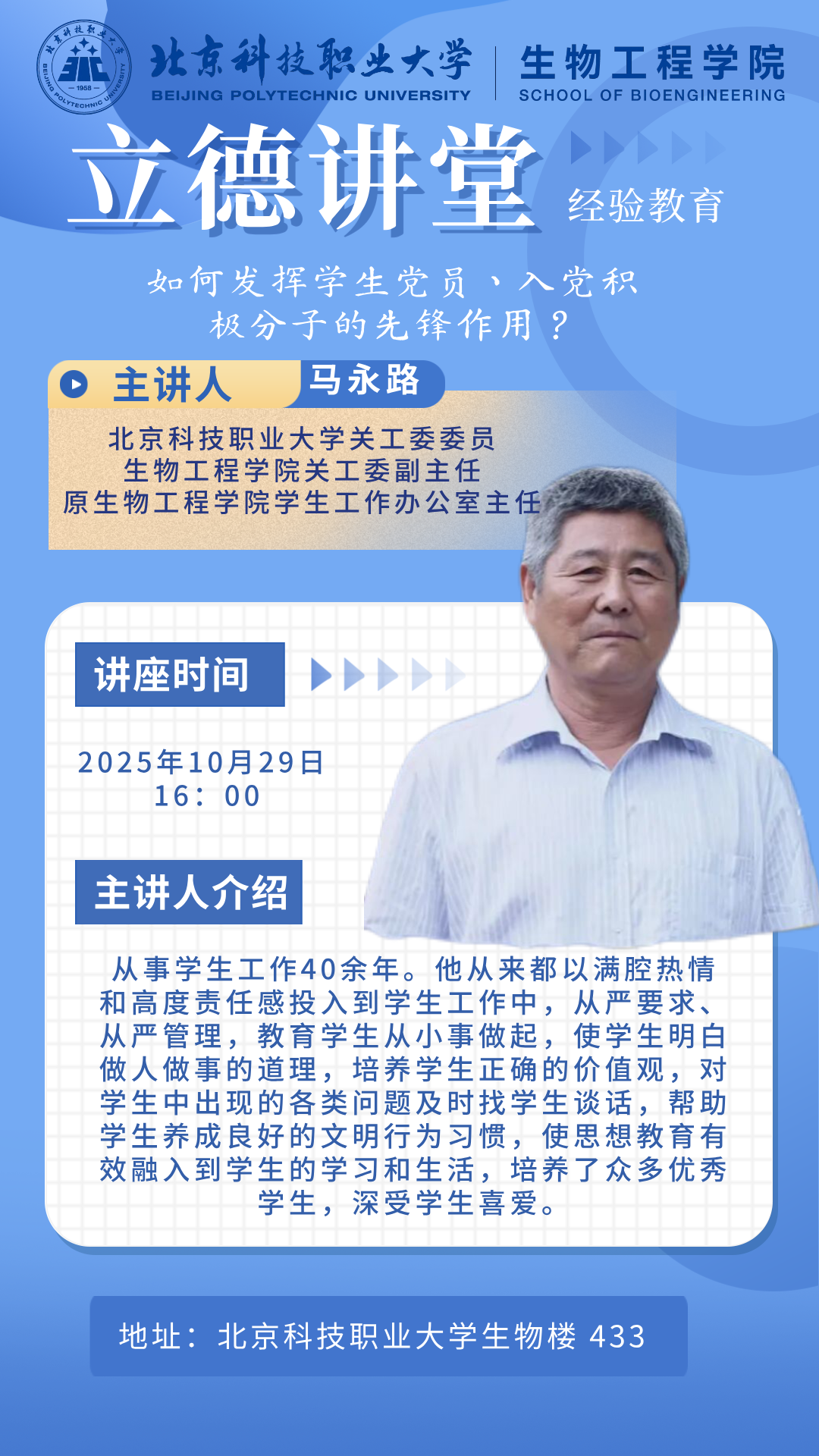 “立德讲堂”是生物工程学院关工委落实“立德树人”根本任务、助力青年学生成长成才的重要举措。在重阳节这个特殊的日子里,它以“老有所为”对接“青春有为”,完美诠释了“银发育青丝”的传承之美,为学院的学生党建工作和思想政治教育注入了深厚的底蕴与力量。