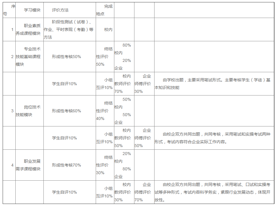 在学徒评价标准设置中,每位学生(学徒)在企业的师傅根据学生(学徒)每个周期的工作过程评价和最终综合评价。每学期为一个周期,企业师傅对学徒本周期主要企业工作内容的完成情况进行评价,指出学徒需要提升的内容,对该生上一阶段及本阶段的对比评价,并指出进步之处和仍有缺陷之处,为学生(学徒)进一步自我完善提供依据。经过企业两年学习和实践,最终的学徒评价完全依据企业实习员工实习期满考核评价中的标准执行。