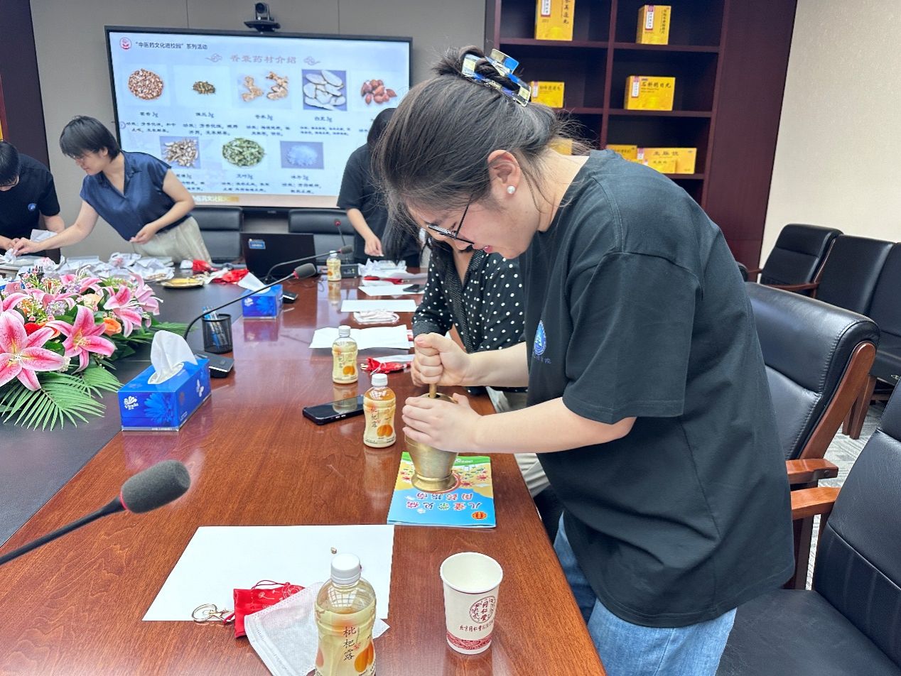 最令人难忘的是亲手制作中药香囊的活动。在同仁堂老师的指导下,团队成员将藿香、丁香、薄荷等中药材按处方称重,进行粉碎,并盛放于布袋中,用细绳紧紧扎起。这个过程虽然简单,却蕴含了对细节的关注和对传统的尊重。当一个个香囊诞生时,它们不仅散发出淡淡的自然芬芳,更承载着对健康的祈愿、对生活的热爱以及对传统中医药文化的继承与传承。