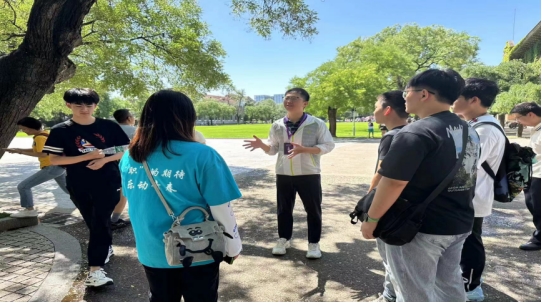 石文昊博士和何梦崎博士带领同学们参观了西大体育馆、清华大学化学馆、三院遗址、英烈纪念碑、二校门、水木清华、清华园等校园景观和历史故事。石博士热情精彩地讲述,让同学们切身体会到走进清华大学是福气和幸运,更加深刻地了解到了清华大学的历史和发展。