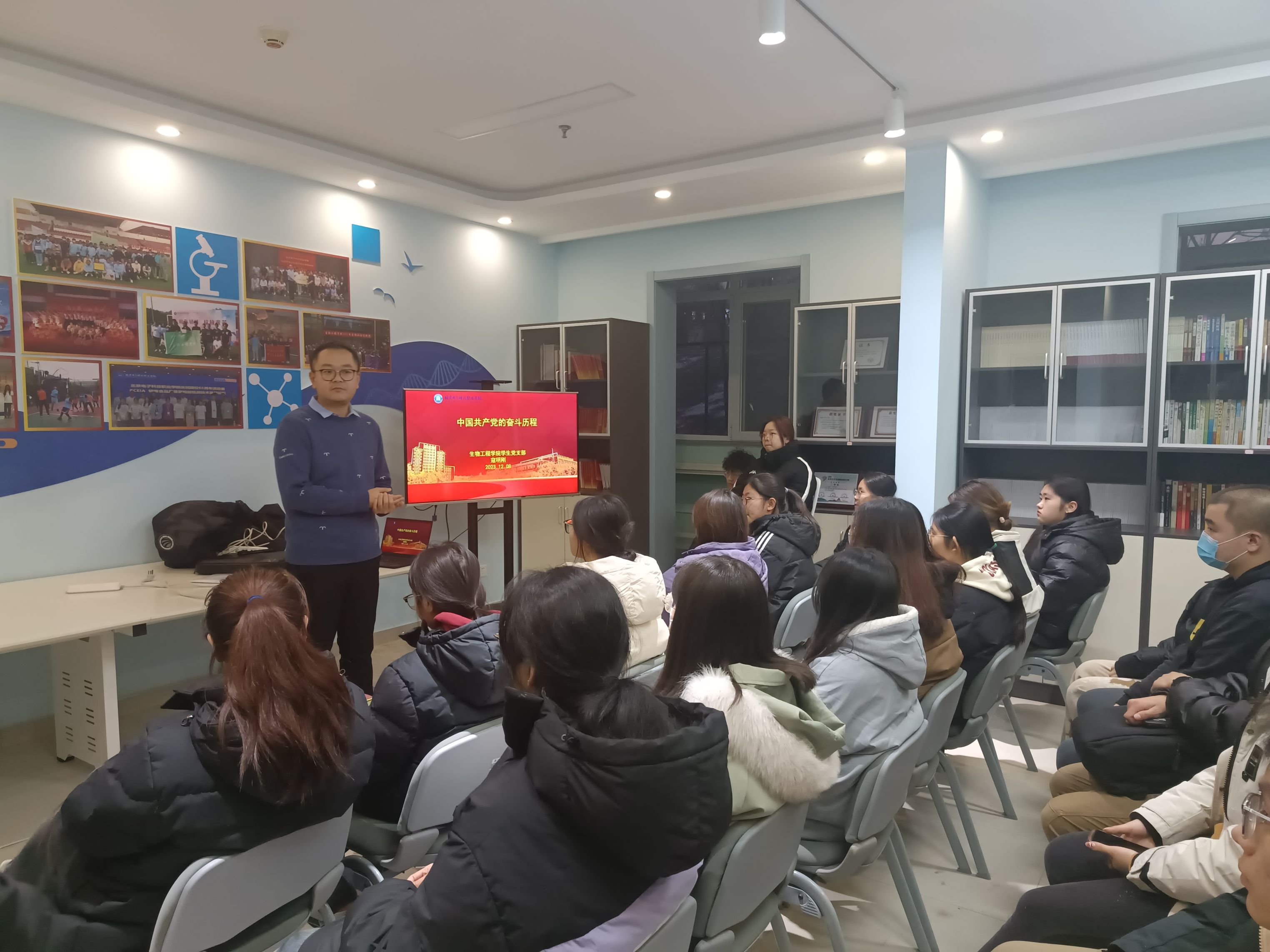 为了深化党团工作站建设,增强“青年楼层小管家”的理论水平,2023年12月18日,党团工作站站长、生物工程学院学生党支部书记寇明刚老师,面向新一期“青年楼层小管家”,开展了“理论加油站——中国共产党奋斗历程讲述”活动。
