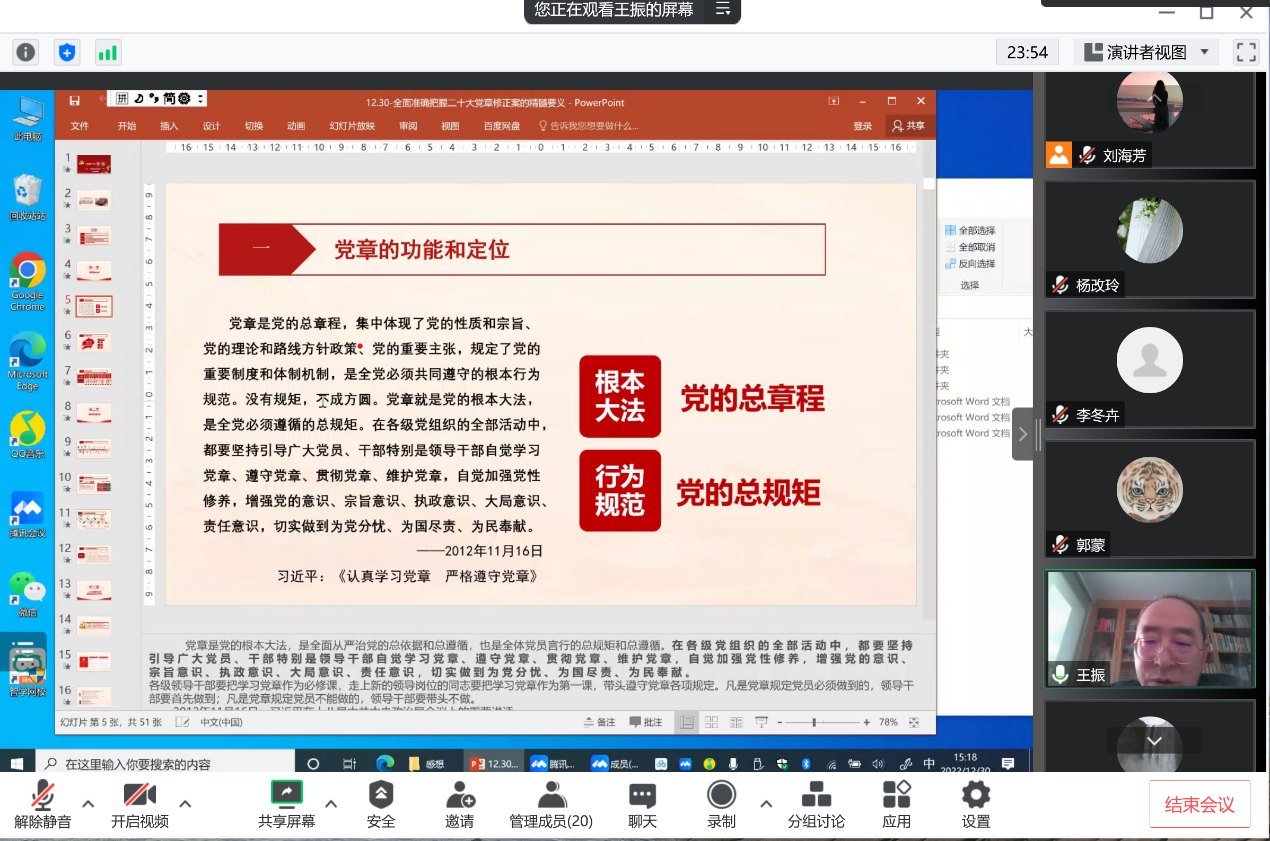 支部书记王振以“全面准确把握二十大党章修正案”为题,对二十大修订的《中国共产党章程》进行了介绍,对修正部分进行了详细的解读。