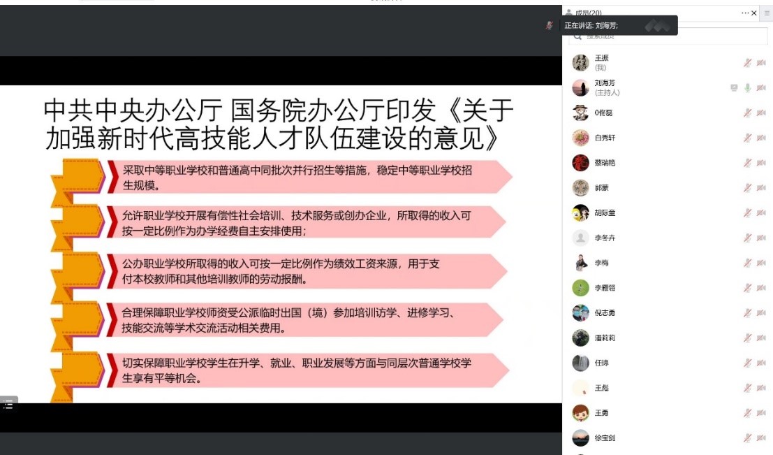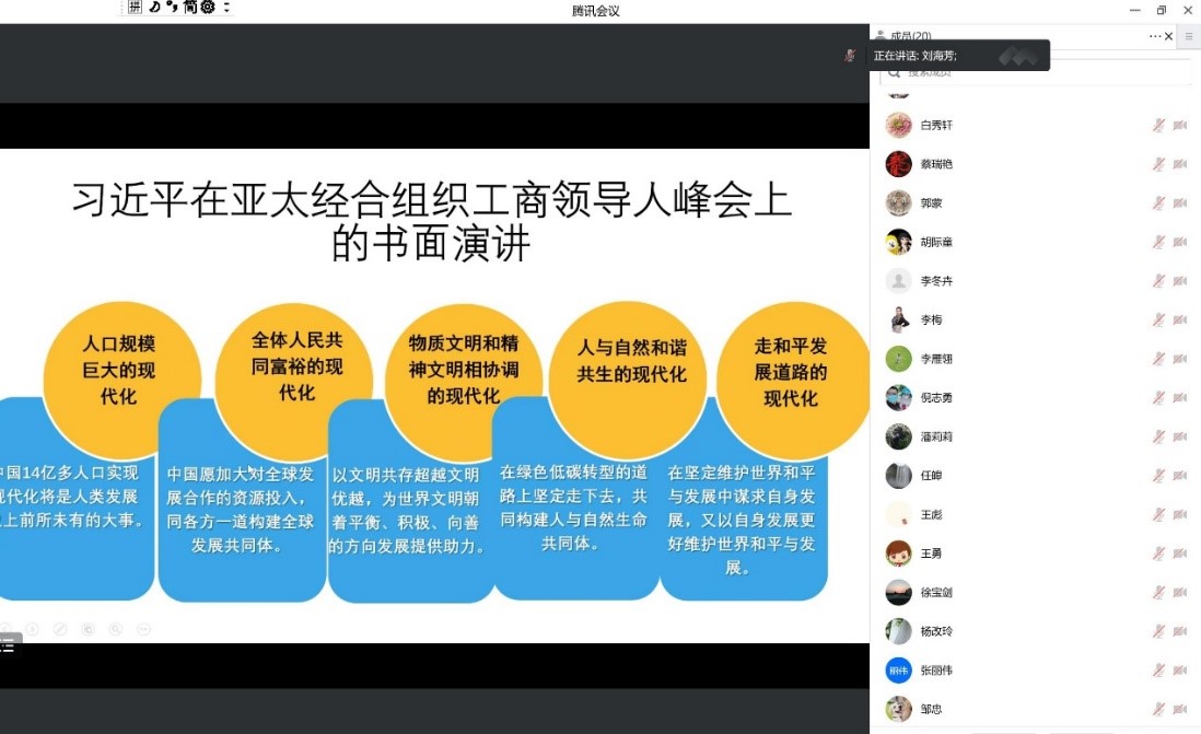 刘海芳老师领学了习近平总书记近期三篇重要讲话:总书记给沈飞集团“罗阳青年突击队”队员的回信、总书记在G20领导人第十七次峰会第一阶段会议上的讲话、总书记在APEC工商领导人峰会上的讲话;“两办”印发的《关于加强新时代高科技人才队伍建设意见》;最高法、最高检、教育部印发《关于落实从业禁止制度的意见》三个专题。