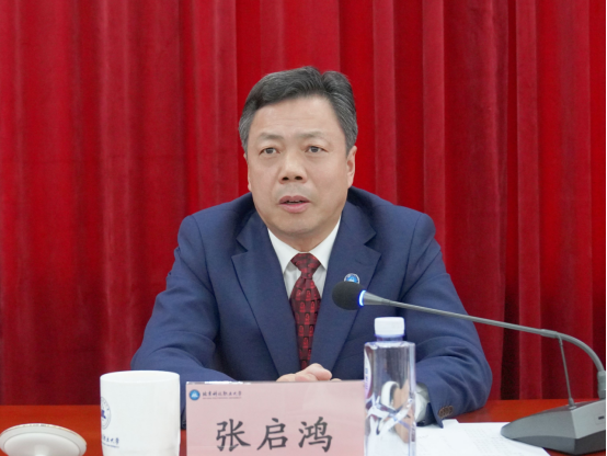 张启鸿在讲话中充分肯定了原基础教育学院全体师生为学校发展、人才培养、双高建设等做出的努力,感谢老师们对机构调整的理解与支持。他强调,原基础教育学院调整为文理学院和体育部,这是学校深化改革、推进治理体系和治理能力现代化的重要举措,旨在进一步强化通识教育、夯实学科基础、突出体育育人,全面提升人才培养质量。他指出,文理学院的成立,是学校构建“理工管艺文”多学科协调发展、深化通专融合培养模式的关键一环。新学院将整合原有优质教学资源,全面承担学校的数学、英语、语文等公共基础课教学,重点建设统计与大数据分析等专业,逐步拓展符合产业需求和学校发展目标的文理类专业集群。紧密结合职业本科教育规律和技术技能人才成长规律,系统推进通识课程体系改革,加强学生人文素养、科学精神、数字能力的培育,为学生可持续发展和终身学习奠定坚实基础。体育部的成立,则是学校加强体育教育、促进学生全面发展的重要举措。体育部将负责全校的公共体育课教学、推进课程改革与师资建设,确保教学模式与职业人才培养目标深度契合。统筹学校大众体育活动,助力提升学生的综合素养与职业适应力,推动全校体育健康事业发展。他对文理学院、体育部提出三点希望,一是坚守立德树人,筑牢数学、英语、语文等公共基础课教学,全面培养学生综合素质;二是强化内涵建设、优化教学管理,借助人工智能与产教融合提升人才培养质量,突破科研瓶颈;三是班子要勇于担当作为,学校将提供资源支持,共创发展新局。