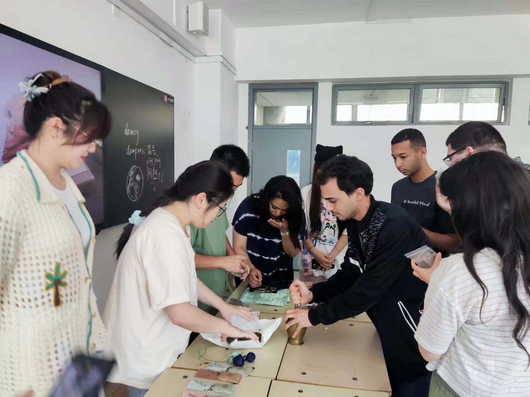 During the activity, the instructors explained to the international students the cultural backgrounds, development histories, and production techniques of Xilankapu and Chinese medicinal sachets. They led the international students to make Chinese medicinal sachets together. Chinese and foreign students jointly experienced the production process of Chinese medicinal sachets, such as selecting medicinal herbs, pounding and grinding with a copper pestle, mixing and sieving, and filling the sachets, and immersively felt the charm of traditional Chinese culture. The international students were deeply impressed by the exquisite craftsmanship of sachet making and the profound cultural heritage it contains.