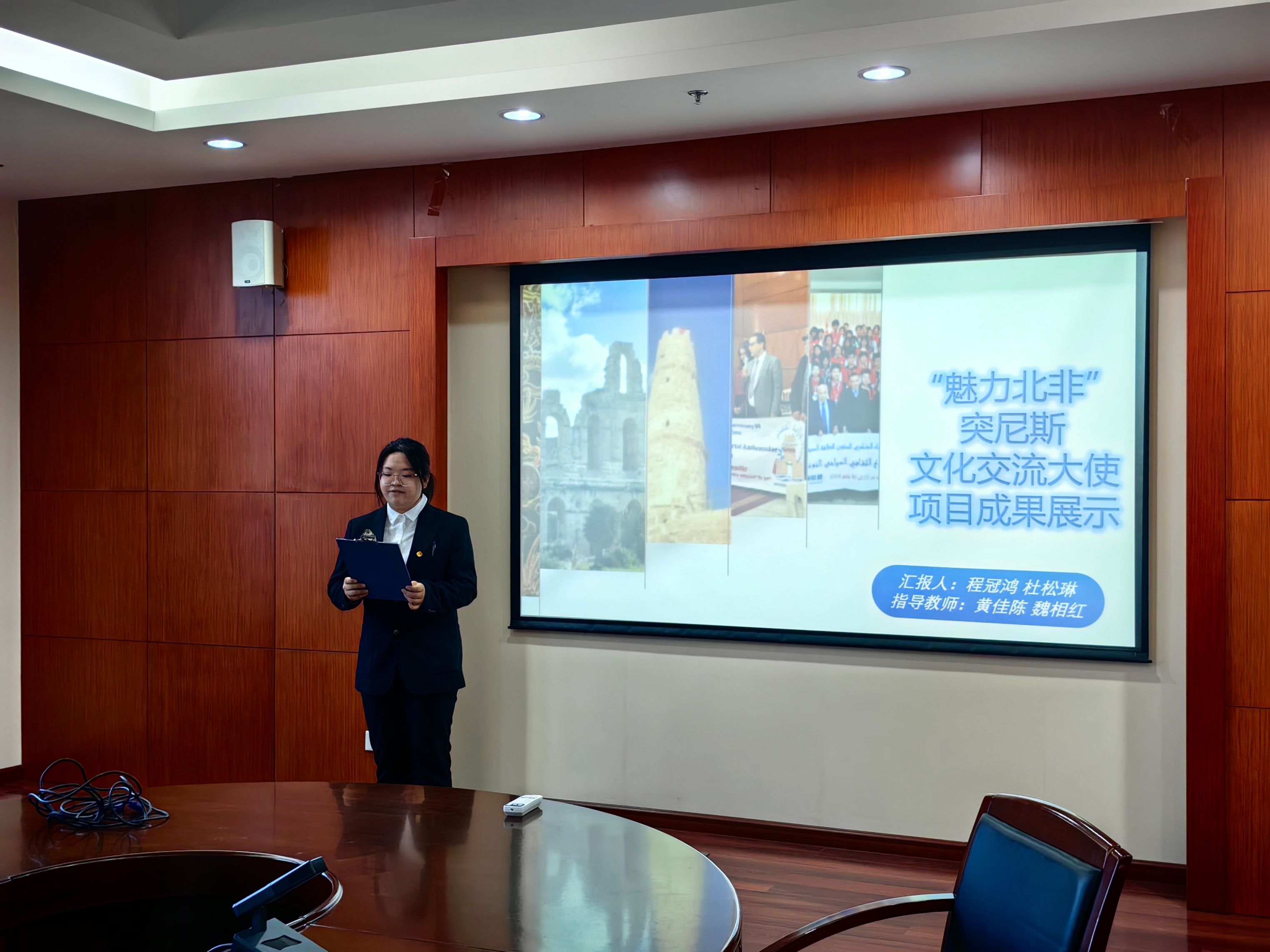 At the symposium, Du Songlin from the School of General Education and Cheng Guanhong from the School of Mechanical and Electrical Engineering, on behalf of the team, reported on the exchange, study, and living conditions during their trip to Tunisia, sharing what they had seen, heard, felt, and thought. The two students recounted their 8-day experience in Tunisia. They visited the University of Monastir in Tunisia, observed the mechanical and electrical engineering training room and biological laboratory of the university, and saw the similarities and differences between local universities and Chinese universities. They had cordial exchanges with local young people and felt the vitality, passion, and learning attitude of local college students. When they visited the Monastir Institute of Fashion and the School of Tourism, they made local ethnic costumes and traditional delicacies with local young people and experienced practical courses that organically combined professional skills with traditional culture. They also visited a local olive oil processing enterprise, planted an olive tree named the "Electronic Science and Technology Tree" in the olive plantation, and participated in local marine environmental protection activities, contributing to the cleaning of the ocean together with local young students.