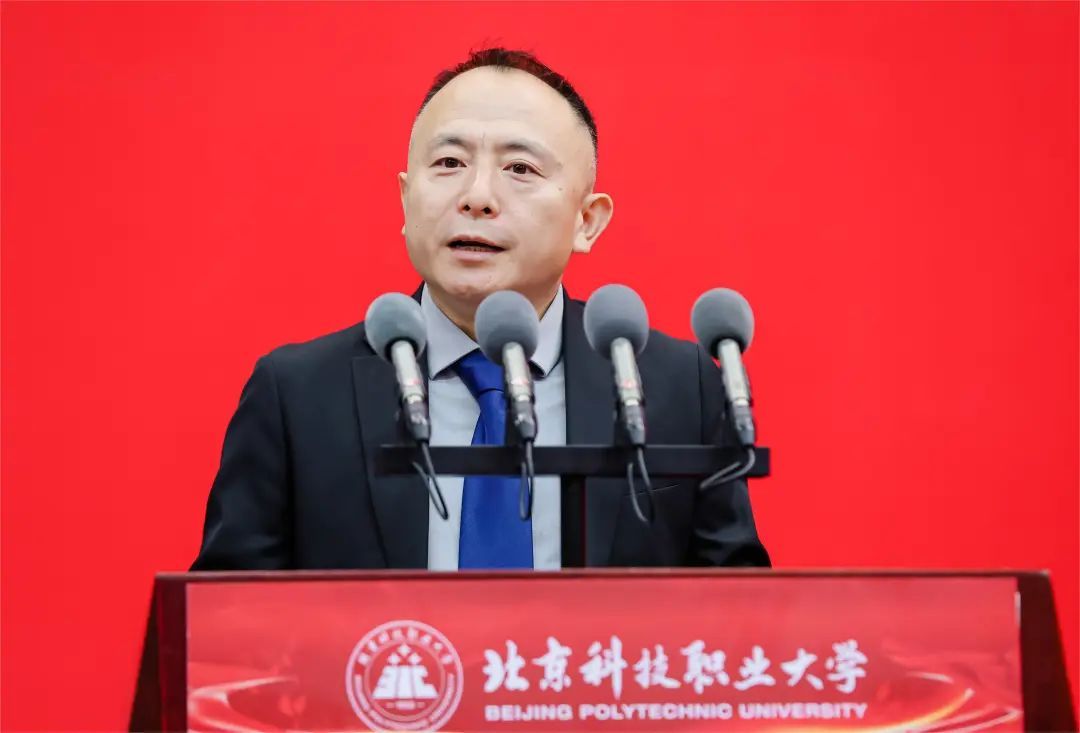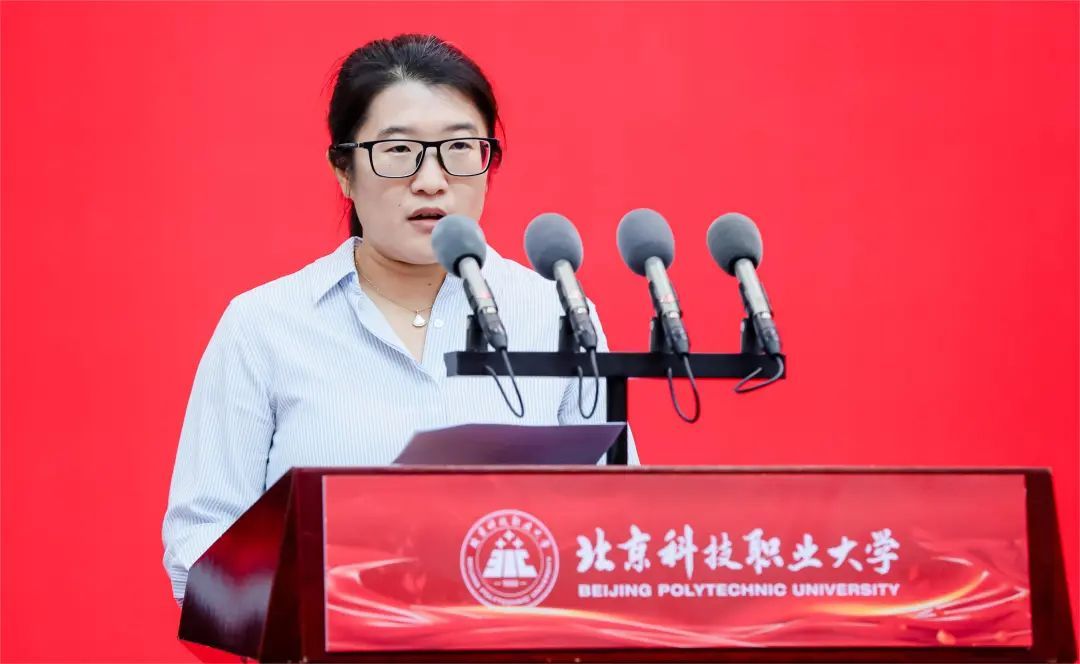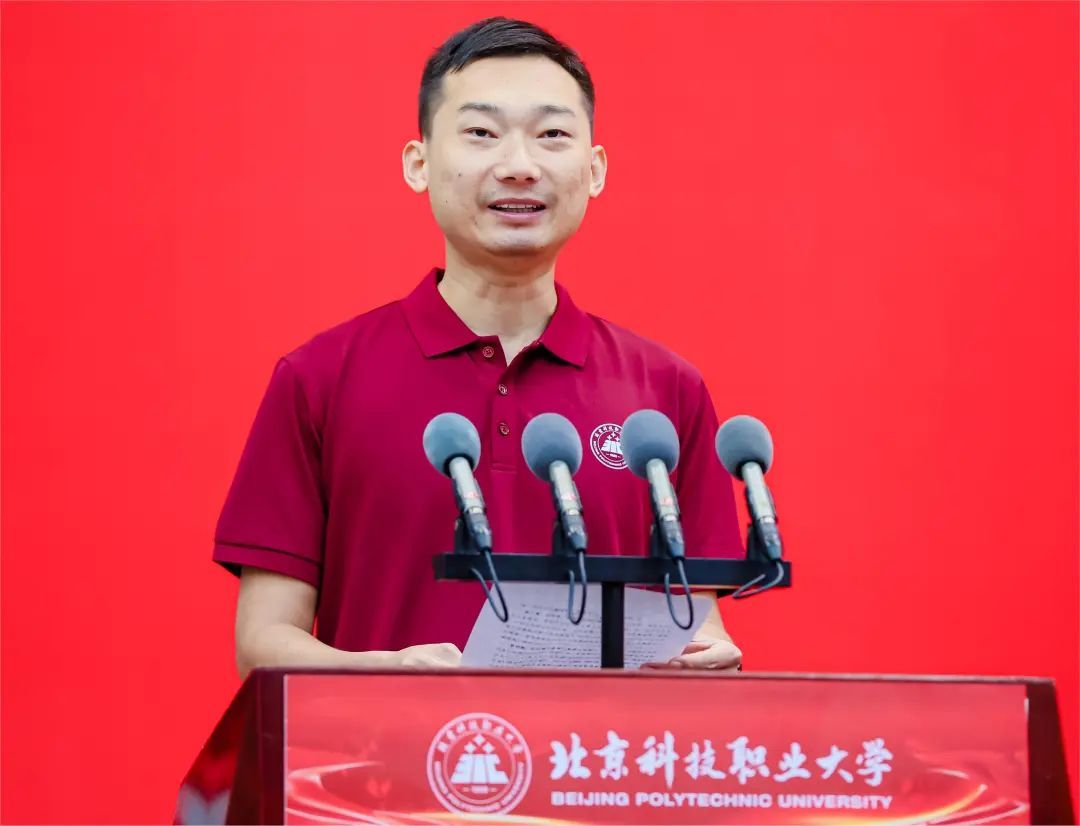 Wang Youran from the School of Aeronautical Engineering spoke on behalf of the freshmen. He shared his pride and joy in becoming a "BPUer" and expressed his expectations for future professional studies. On behalf of all freshmen, he promised that under the guidance of the university motto "Essence, Integration, Goodness, Innovation", they would root themselves in professional learning, temper excellent skills, refine true knowledge in classes, forge sharpness in practice, gather great strength in cooperation, align their personal growth with the development of the motherland, and contribute their youthful strength to the construction of a powerful technological country.