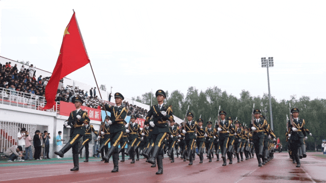 The valiant members of the national flag guard team stepped forward with sonorous and powerful steps to escort the national flag into the field. Subsequently, the school flag square team and the red flag square team came forward with their heads held high.