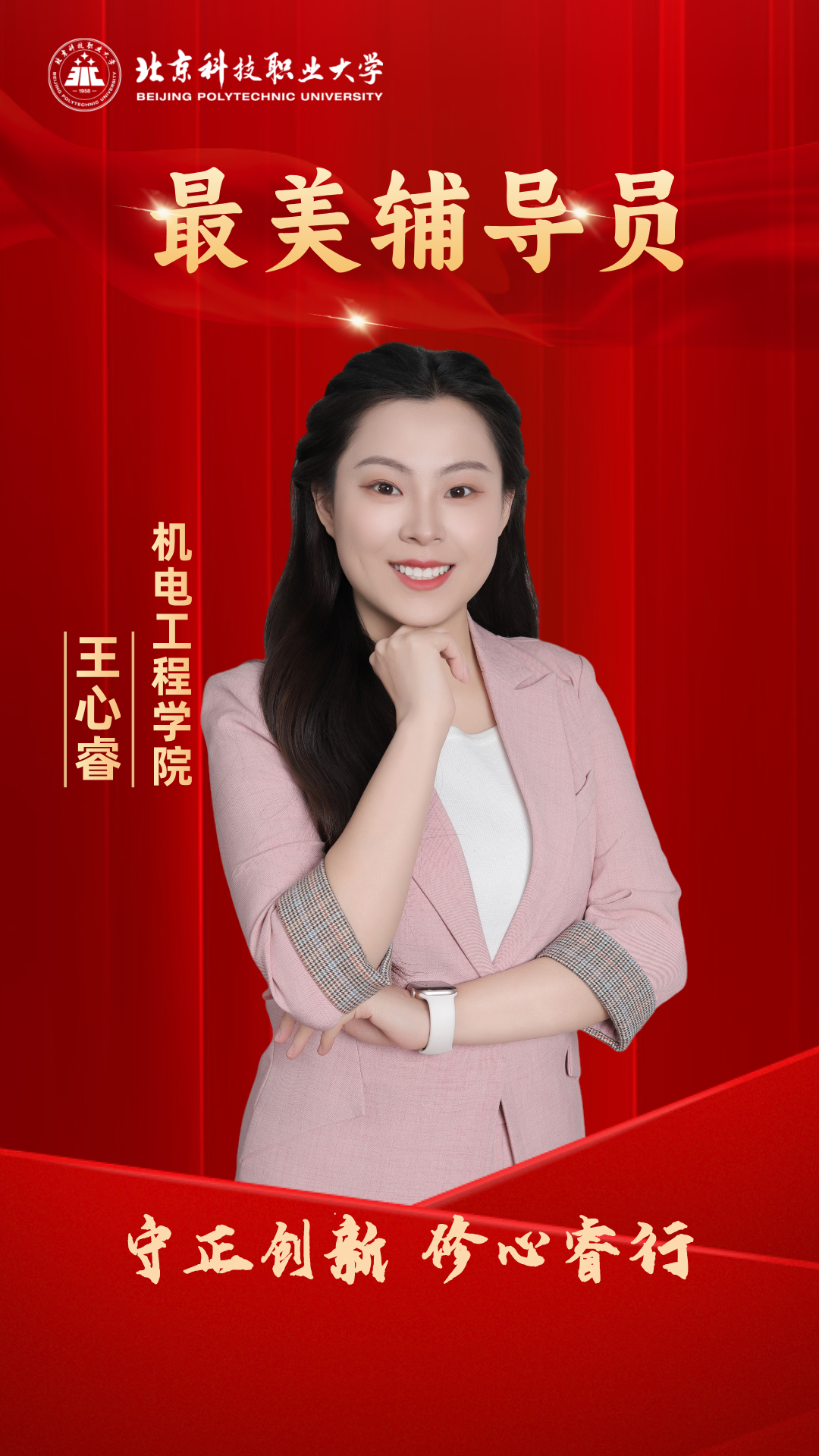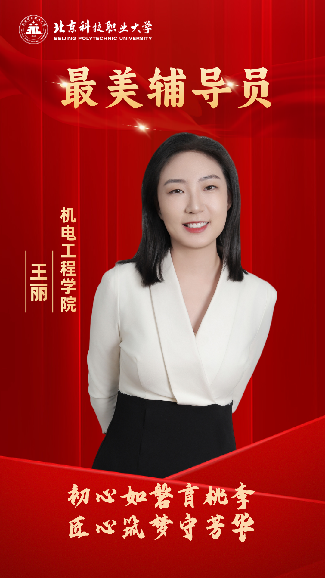 王丽,机电工程学院辅导员。她深耕育人一线,创新 “四维联动” 育人体系,联合辅导员打造 “海棠” 思政品牌,建 “枫桥心语” 辅导员工作室,精准帮扶学生。主持并完成北京市教育规划课题1项,发表多篇论文。指导学生获 “挑战杯”“互联网 +” 等市级竞赛一等奖,以初心践行育人使命。获奖感言感谢学校给予这份荣誉,感谢同仁们的支持与同学们的信任。从踏上辅导员岗位起,我始终记得 “以生命影响生命” 的初心。我的每一份付出都因学生的成长而有意义。同学们的每一份成绩,都是我前行的力量。未来,我会继续以初心为桥,深耕育人一线,陪同学们共赴芳华。