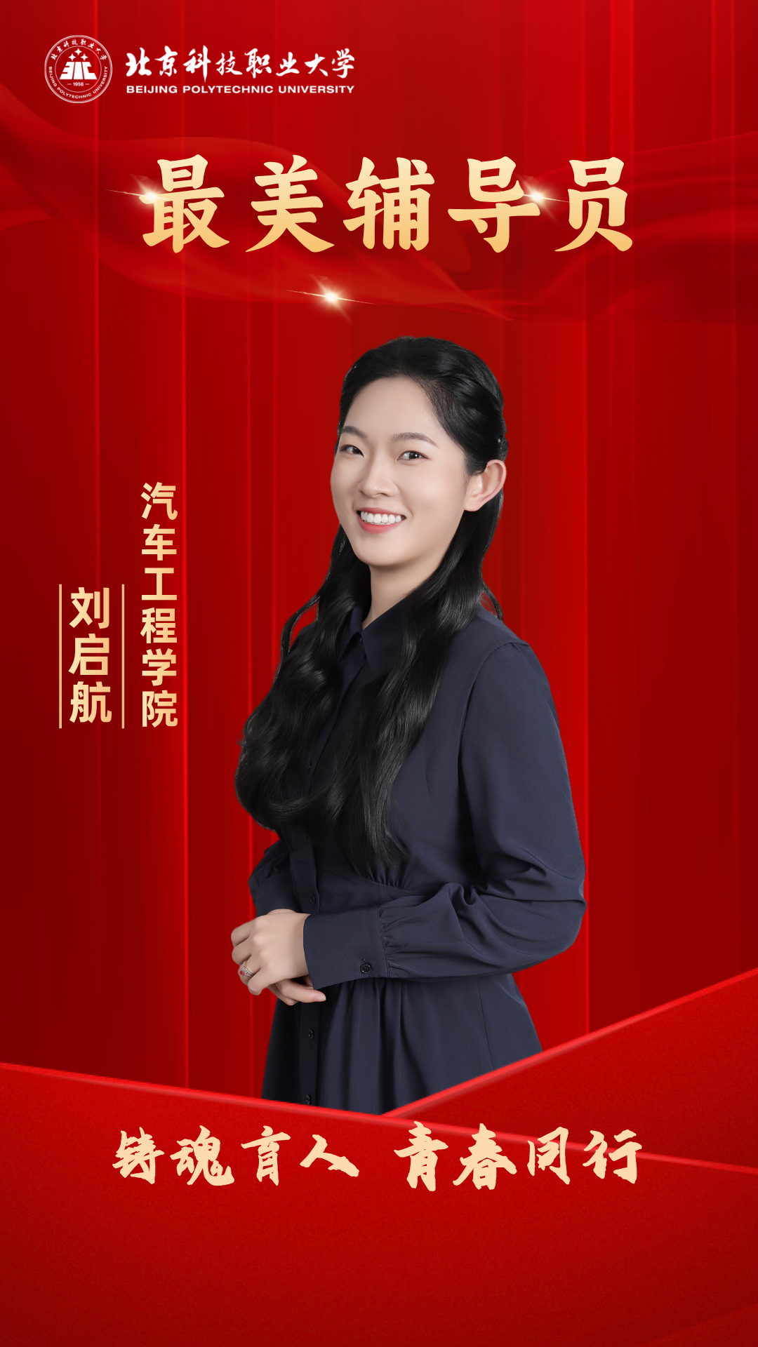 刘启航,汽车工程学院专职辅导员。毕业于首都师范大学,教育学硕士研究生。教授课程:《心理健康教育》,在研课题:传统文化作为学生活动在职教校园中提升文化自信情况的研究——以京剧为例。论文、专著:《推动职教学子文化自信入脑入心的研究——以京剧为例》 《劳动技能与工匠精神》。她是校级辅导员工作室“京韵启航”主持人,校京剧社团指导教师。原创京歌:《我是电科人》《我是北职人》。获奖感言以培育大国工匠为己任,我将把服务党和国家的教育事业作为矢志不渝的奋斗方向;在思想引领的旅程中,我与学生携手并肩、共历风雨,守护他们茁壮成长、逐梦前行,这是我始终坚守的初心本色。能投身这样一份让我收获满满、幸福洋溢的职业,我深感幸运。教育本无繁复秘诀,唯有倾注爱与担当,学生们的逐梦征途,启航老师,一直都在!
