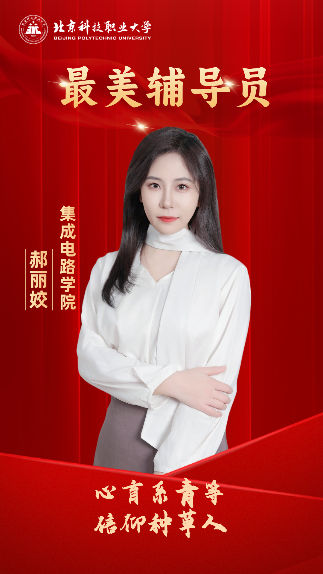 郝丽姣,集成电路学院(人工智能学院)专职辅导员。她秉持“为党育人、为国育才”初心,聚焦职业院校人才培养,以培养“又红又专、德技并修”的高素质技术技能人才为目标,探索形成“党、团、班、宿、社”五位一体协同机制,将首都红色底蕴、区域产业资源与学校职教特色融入育人全过程。发表学术论文3篇,主持校级课题1项、参与重点课题1项,主持“青心引力”辅导员工作室。所带学生斩获世界职业院校技能大赛总决赛金奖,指导学生参加全国大学生职业规划大赛等赛事屡获市级奖项,以专业赋能与情感浸润助力学子成长成才。获奖感言教育者的荣光,不在聚光灯下,而在深夜长谈后学生眼中重燃的星火;不在奖杯镌刻的名字里,而在迷途者找到人生坐标时的会心一笑。这份事业是静待花开的“慢”艺术,是以生命温度焐热心灵的修行。我珍视这份平凡而神圣的耕耘——做信仰的播种者,厚植家国情怀;当成长的摆渡人,涵养奋进精神。以爱为壤,以责为犁,在立德树人的沃土上躬耕不辍,静待信仰的种子在时代春风里,成长为支撑未来的参天大树!