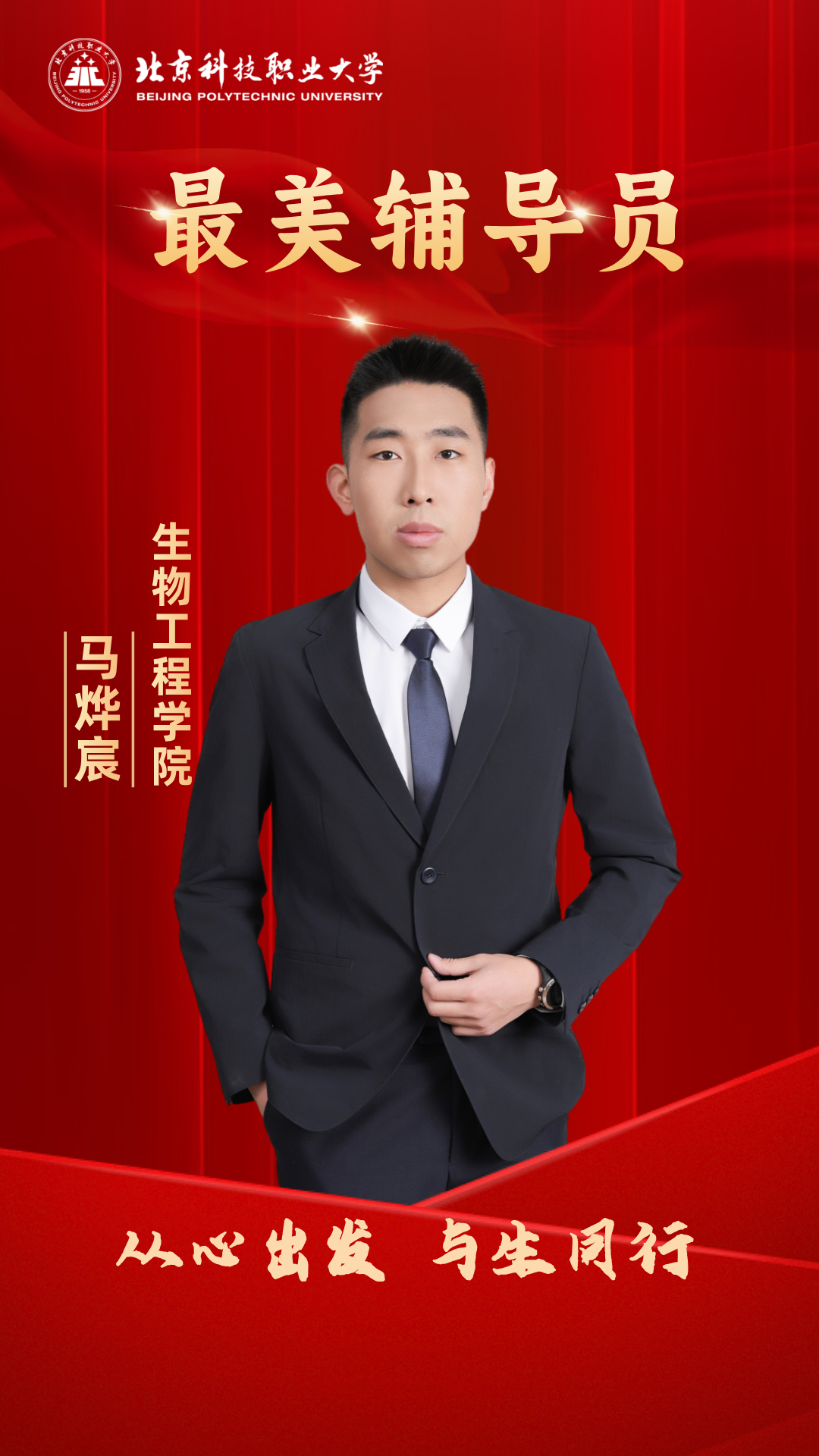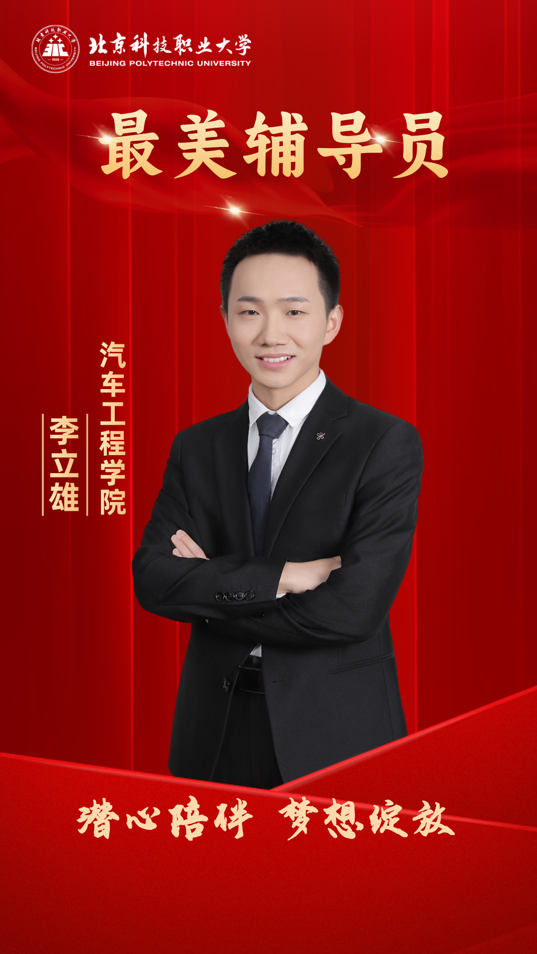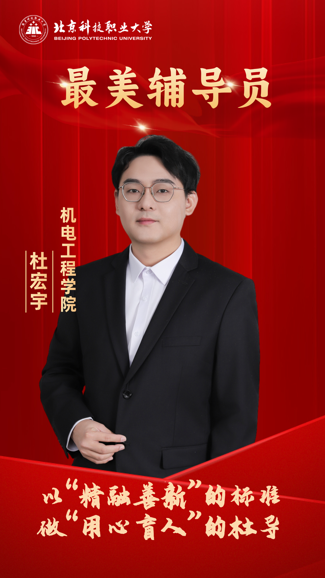 杜宏宇,机电工程学院辅导员。他是学生“心目中的好老师”,“精融善新”是他的工作准则。政治素养业精于勤,做好学生的引路人,“党团班宿社”联动,2025年被评为校级优秀共产党员;作为潮汐话剧团指导教师,他将话剧小舞台融入思政大讲台,举办首届北职大话剧节;寒暑假社会实践带领学生用脚步丈量祖国大地,累计指导20余团队,获全国重点团队;志愿服务善作善成,作为负责人统筹世界机器人大会、亦庄半程马拉松志愿者,参与两会志愿服务,荣获人大办公厅表扬信;带领学生开拓创新,指导学生参加“挑战杯”“中国国际大学生创新大赛”获市级金奖,连续两届获得北京市职业规划大赛优秀指导教师。获奖感言很荣幸肩负起“最美辅导员”的称号,希望这个“最美”不是标量,而是矢量,它永远有箭头,有前进的方向,明天的我会比今天的我更美一点。我会始终以“红色基因传承者”的自觉、“三全育人践行者”的担当、“工匠精神播种者”的执着,“美育浸润拓展者”的创新,用实际行动诠释新时代高校辅导员的初心使命,坚持“以生为友,以文化人,用心育才,做学生最坚实的后盾”。