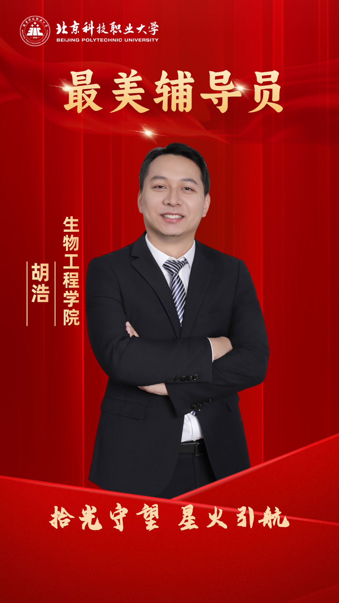 胡浩,生物工程学院辅导员,学生党支部书记。他始终践行“从学生中来,到学生中去”的理念,聚焦学生素养提升,解决学生实际困难,助力学生全面发展。组建“生物小微”新媒体阵地,完善“优学助研”学生“双创”比赛体系,创新寒暑假社会实践衔接工作法,探究专业社团建设与学生劳动教育融合路径,打造“思政+科研+实践+劳动+双创”育人模式,成立“知心·织新”辅导员工作室。近5年,带领学生在各类“双创”大赛中获得国家级奖项20余项,省部级奖项100余项,3次获得“首都大学生社会实践”先进工作者。获奖感言匠心筑梦,技能报国,用点点心灯照亮青年前行的方向,是我心中不灭的信念;以心换心,风雨同舟,守护每个梦想生根发芽,是我脚下坚定的道路。每一次深夜的消息、实验室的灯火、备赛的蜕变、奖台上的闪耀,都让我深深感受到这份职业的获得感与幸福感。你们每一次突破自我、斩获国家级、省部级奖项的喜悦,就是对我工作最深的回馈。辅导员无他,唯爱与责任。这“最美”的称号,将永远鞭策我用心守护、用情陪伴,做你们梦想的“织新”人!