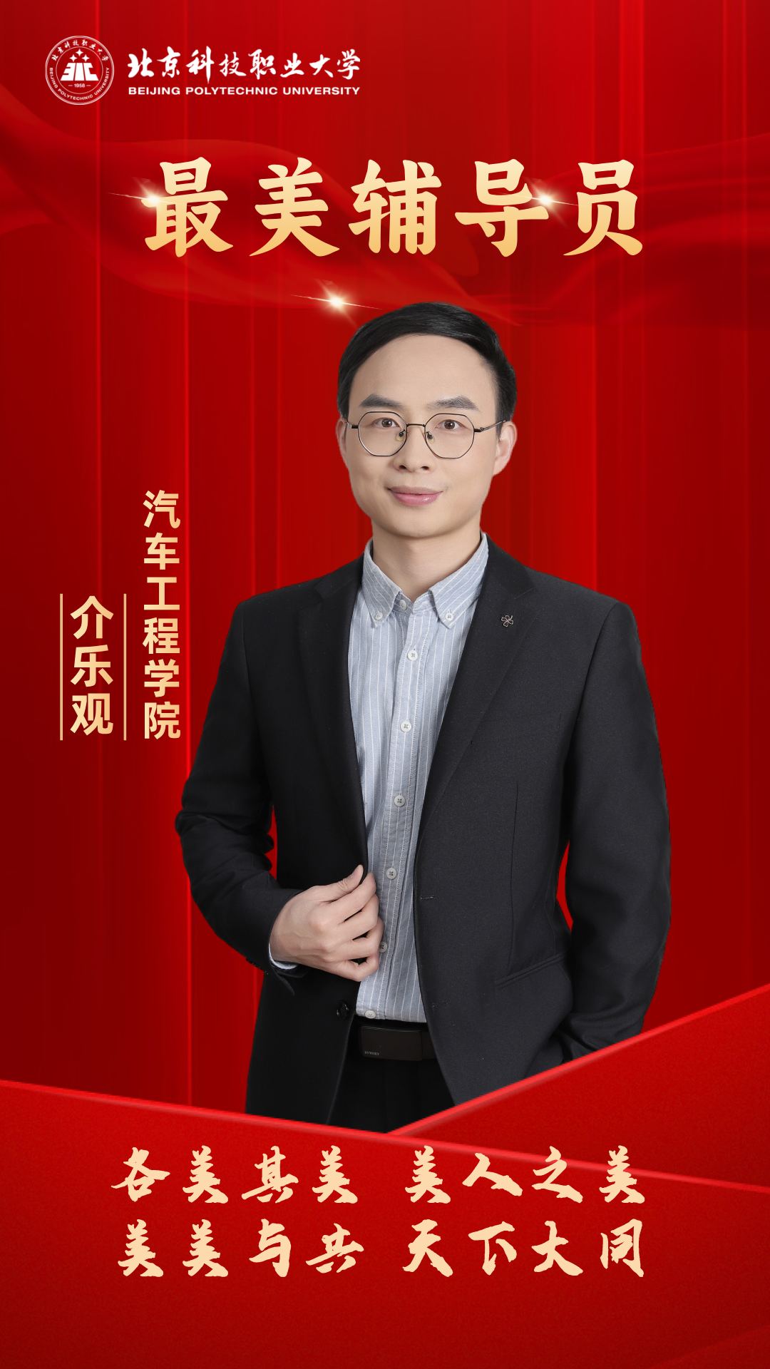 介乐观,汽车工程学院辅导员,秉承立德树人初心,坚守“为党育人、为国育才”使命,助力学生成长成才,累计培养600余名学生,深受学生喜爱,曾三次获评校级优秀辅导员。他善于引导学生理论联系实际,用专业知识服务社会,指导学生开展社会实践活动,多次获评市级社会实践优秀团队,3次获评市级社会实践先进工作者。他注重工作方式方法创新,育人效果显著,曾多次指导班级获评北京市优秀学生基层组织、北京市先进班集体,2025年指导学生获评第二届全国大学生职业规划大赛银奖。他善于研究思考,作为负责人,承担厅局级课题一项,校级课题3项,参与课题5项,发表论文3篇,在编专著一本。获奖感言承蒙学校厚爱培养,这份荣誉是认可,是激励,是责任,八年辅导员工作生涯,我用真心、真情、真诚走进学生心灵,教会他们为学、为事、为人,引导同学们匠心筑梦,技能报国,用实干和担当践行强国有我的铮铮誓言。八载青春,品尝的是陪伴与成长的甘甜,收获的是笑中带泪的感动,为党育人为国育才将是我永恒的坚守!