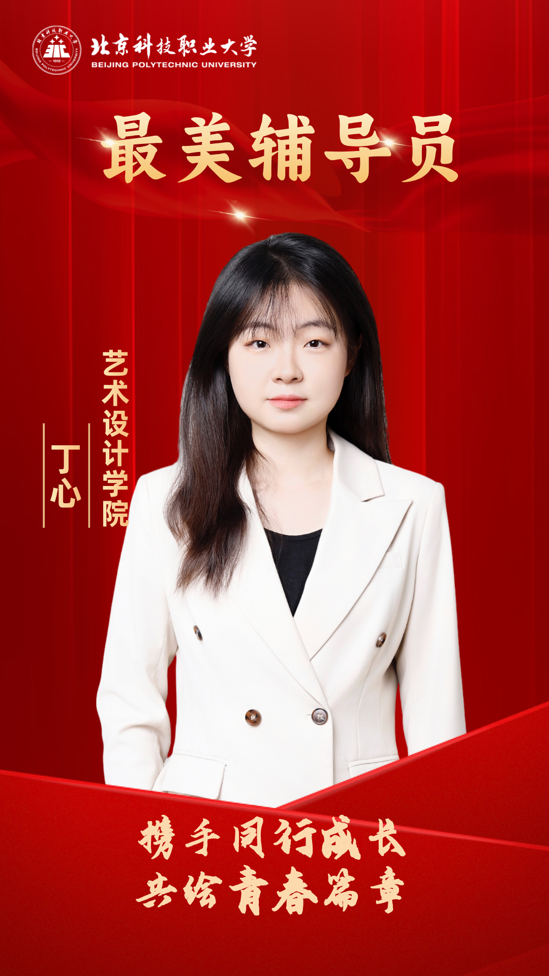 丁心,艺术设计学院辅导员,学生党支部组织委员。她以“为党育人、为国育才”为使命,始终秉持做青年学生引路人的初心,指导所带班级获评北京高校示范学生基层组织、北京市先进班集体。她深耕实践育人阵地,指导团队、学生多次获得社会实践特等奖及先进个人,累计获得国家级、省部级大赛荣誉30余人次,曾获首届全国大学生职业规划大赛北京赛区优秀指导教师、北京教育系统关工委“读懂中国”活动优秀指导教师、2025年辅导员素质能力大赛三等奖、2025“辅导员说‘我的育人故事’”比赛二等奖、2023年校级“我心目中的好老师”等荣誉。获奖感言回首过往,是伏案耕耘的勤勉,是学生成长的喜悦,是青春绽放的荣光,更是“捧着一颗心来,不带半根草去”的赤诚。未来,我将继续秉持“教书育人、服务社会”的宗旨,以更加饱满的热情和坚定的信念,深耕思想引领沃土,探索创新育人模式,为培养担当民族复兴大任的时代新人贡献自己的智慧和力量!