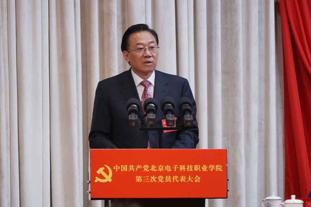 张革代表北京市委教育工委对大会的召开表示热烈的祝贺。他指出,自第二次党代会召开以来,学校党委始终坚持党的全面领导,全面开启建成高水平技能型大学新征程;始终坚持立德树人,在引领电科青年充满自信、意气风发走好新时代职业发展之路上展现新作为;始终坚持改革创新,树立了全国职业教育发展新范式;始终坚持服务首都高质量发展,为服务经开区和新时代首都发展作出了重要贡献。