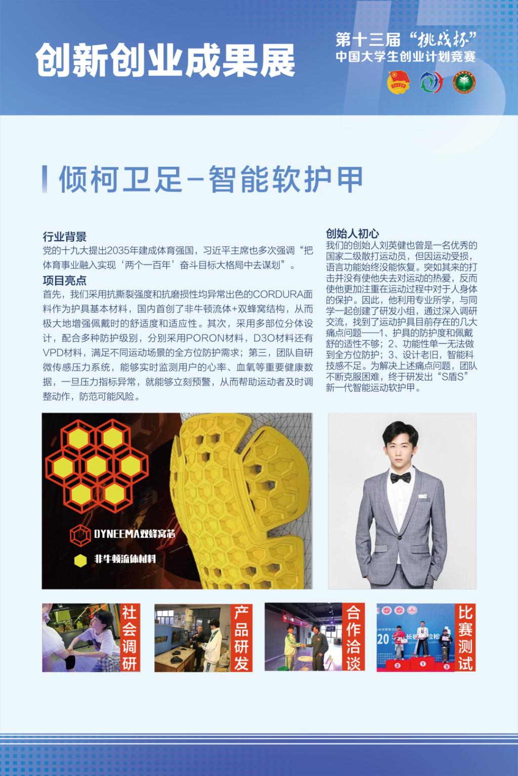 第十三届“挑战杯”中国大学生创业计划竞赛由共青团中央、教育部、人力资源社会保障部、中国科协、全国学联、北京市人民政府主办,北京理工大学、共青团北京市委、北京市房山区人民政府承办。本届赛事共吸引全国3011所学校、142.4万名学生直接参与,申报创新创业项目33万个,共有463个项目晋级全国决赛终审答辩,其中就有BEAT365推报的“倾柯卫足”智能软护甲项目和“佰泰”急救药物入口智能弹射手表项目。
