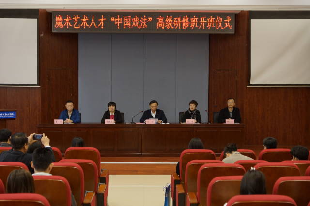刘正宏首先致辞。他向出席的领导、来宾、老师和学员致以最热烈的欢迎,介绍了艺术设计学院一直以来对传统艺术文化的传承与发展等方面所付诸的实践,展望魔术艺术学院的未来,期待学员们能够在专家团队的带领下,创作出更多精彩作品。李宁指出研修班将致力于推动中国魔术的职业化教育进程,化解魔术专业难点,分享魔术行业热点,解决魔术行业痛点。教师代表胡金玲介绍了课程设置,其中覆盖中国戏法,幻术,魔术等多个领域,多种类型,针对中国魔术安排了魔术历史,魔术理论,作品指导,手法技巧,创作制作,赏析等多个方面的专业课。学员代表李晶晶介绍了自己自学魔术和创办魔术杂志的心路历程,表达了对此次研修班项目组及全体工作人员的感谢。刘挥提到此次研修班是增强“四个意识”、坚定“四个自信”的具体工作之一,各位学员要深入贯彻:听党话、跟党走、繁荣创作、服务人民的文艺理念,为推动京津冀新发展提供坚强的文艺保障。最后,辛秀兰代表学校再次致以热烈欢迎,对北京文化艺术基金表达了感谢,希望学员圆满完成各项培训任务,在展演舞台上大放异彩,做到学有所得,学有所获。