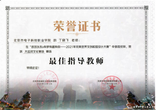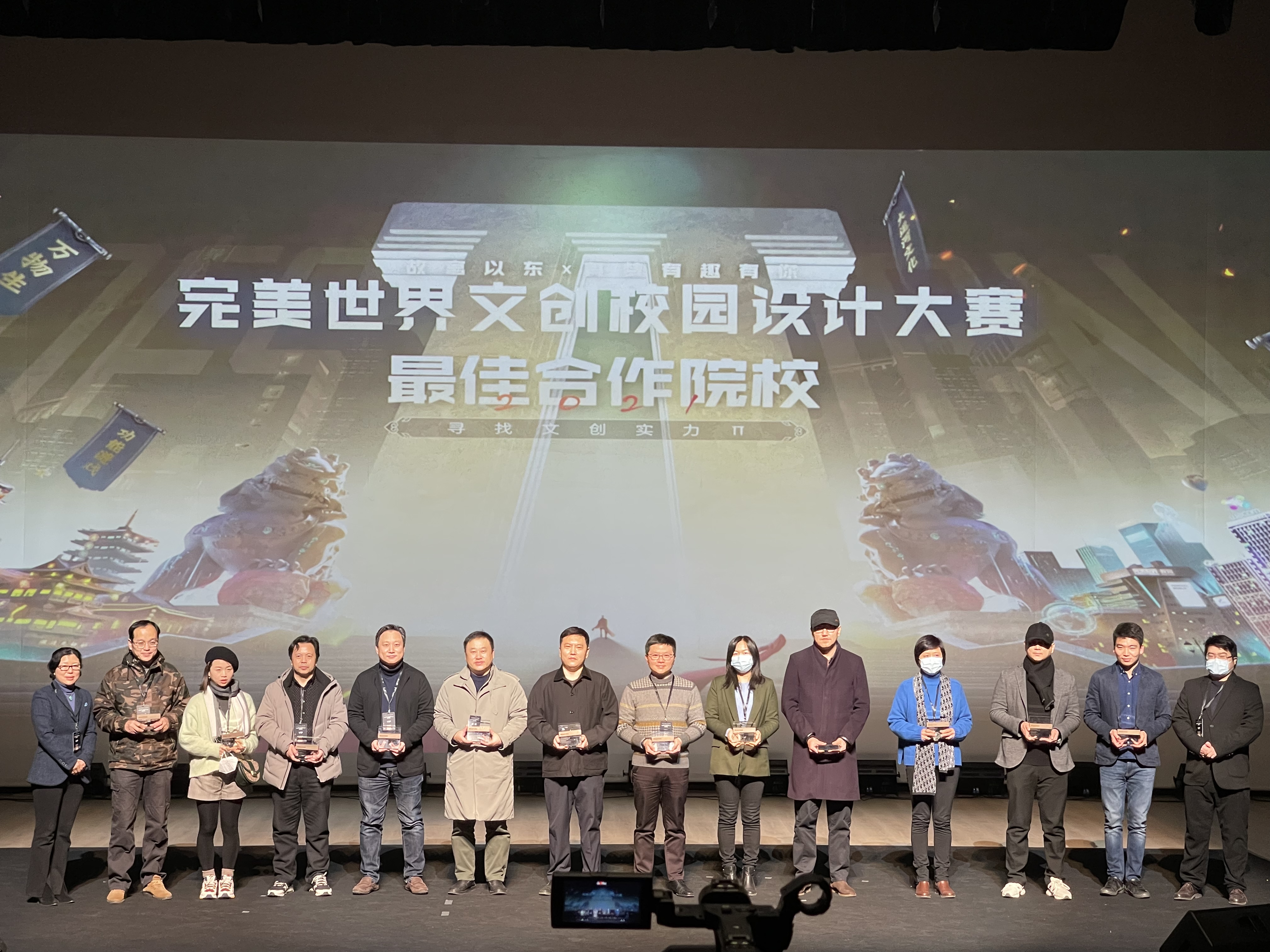 12月23日,由2021“故宫以东 x 有梦有趣有你——完美世界文创校园设计大赛”颁奖典礼在北京东城区吉祥大戏院举行,BEAT365艺术设计学院在本次大赛中中获最佳合作院校奖,艺术设计学院教师丁晓飞获最佳指导教师奖,艺术设计学院2021级新生李展毅获得三等奖(一二三等奖共十名获奖)。完美世界文创校园设计大赛由中共北京市东城区委宣传部指导,完美世界控股集团和北京市东城区文化和旅游局共同主办,是一项向全国在校大学生、以创新孵化为特色的全国性赛事,全国近500家院校的超万组同学参赛。
