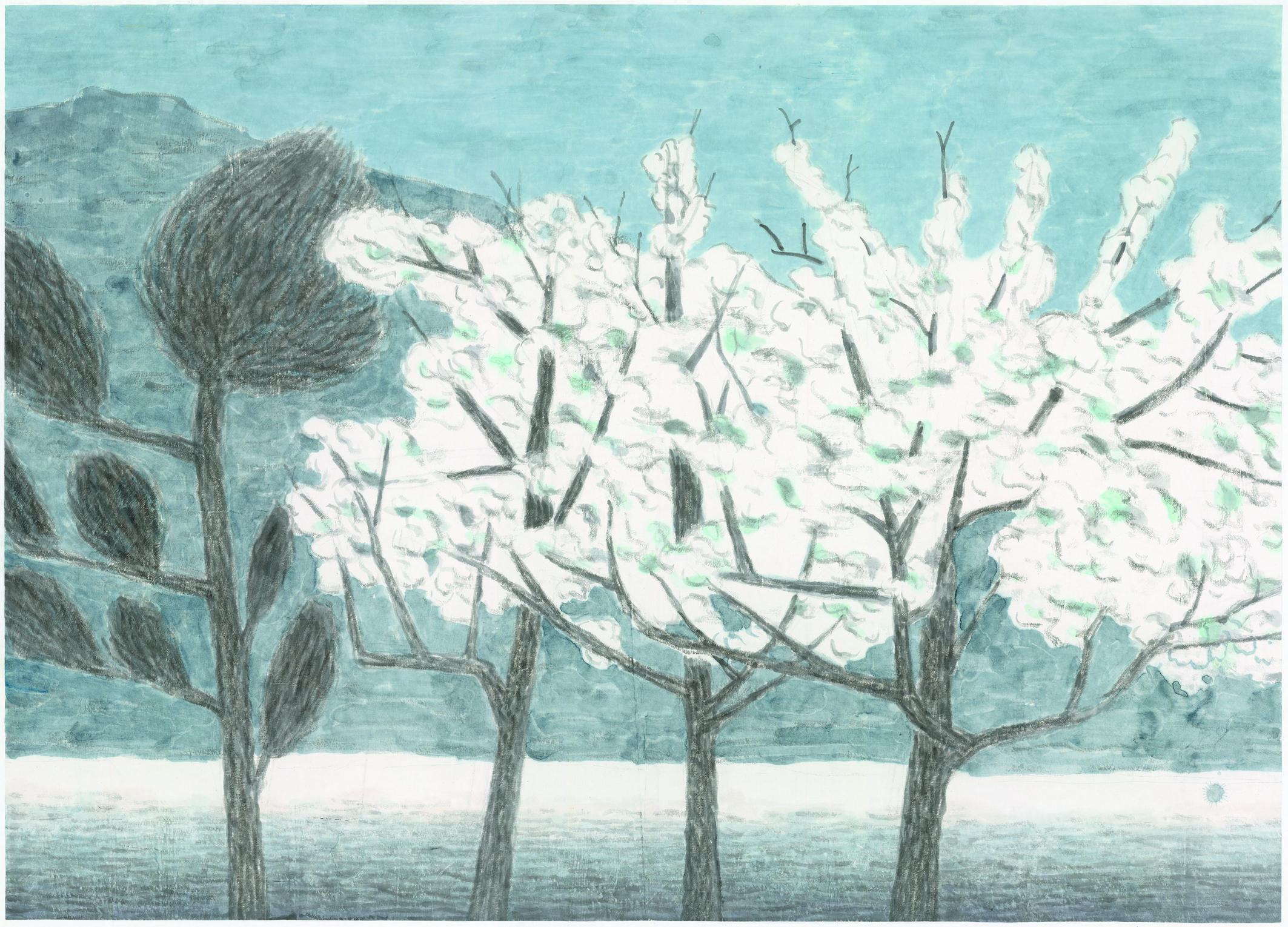 胡明强《山路梨花》2019年,120·170,彩墨纸本