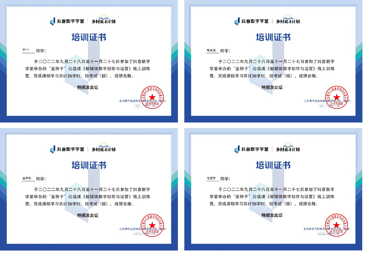 该项目由孙磊老师组织,艺术设计学院传媒系影视、数媒、游戏专业共有71名学生参与《新媒体创作与运营》金种子课程学习,21广播影视1班姚勃羽同学为课代表。经过三个多月的努力,2022年12月底,学生们通过了字节跳动公司的最后一项考核,圆满修完本学期的《新媒体创作与运营》金种子课程。学生们通过字节跳动公司的线上、短视频制作、直播等多项考核,取得字节跳动(抖音)公司培训证书。