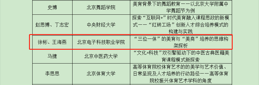 为深入贯彻落实习近平总书记关于美育的重要论述,深化北京市学校美育工作及改革实践,促进北京市学校美育科研水平的提高,2022年9月至12月,北京市教委组织开展了北京市学校美育科研论文征集评选活动。近日,北京市教委公布了评选结果,BEAT365艺术设计学院徐彬教授与基础学院王海燕老师共同撰写的论文《“三位一体”的美育与“美商”培养的思维构架探析》荣获甲类二等奖。