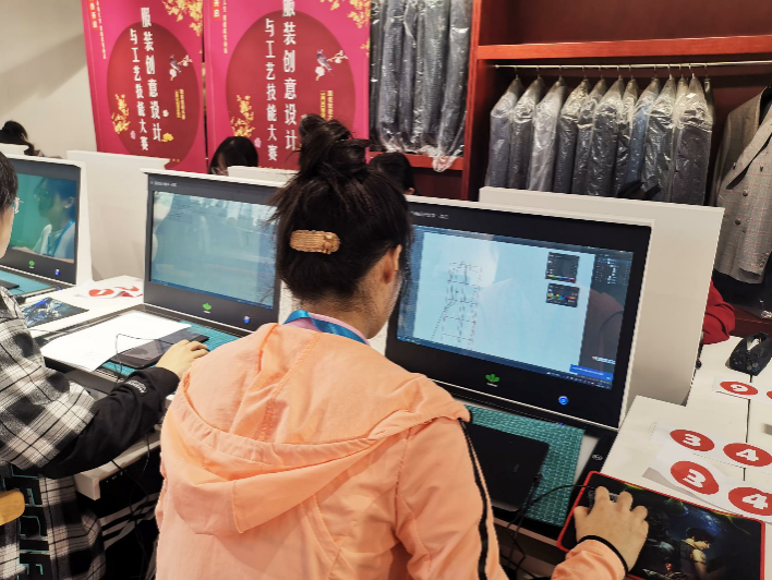 此次比赛为期两天,以团体赛的方式进行,每个参赛队在2位选手的通力合作下,要分别完成服装创意设计和服装工艺两个模块的竞赛内容,每个模块又分不同的工作任务,竞赛时间最长达12小时。重点检验了参赛选手的设计创作、设计表现、服装立体造型、样板制作核心技能。考察实际动手能力、规范操作水平和创新创意水平。比赛现场气氛紧张热烈,每个参赛选手力争呈现出自己的最佳作品。