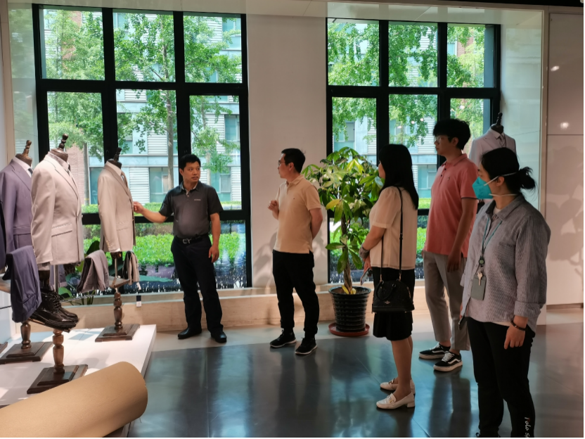 格雷时尚董事长办公室经理王久林接待调研团队,并带领参观了公司发展成就展和新出品的春夏系列成衣。