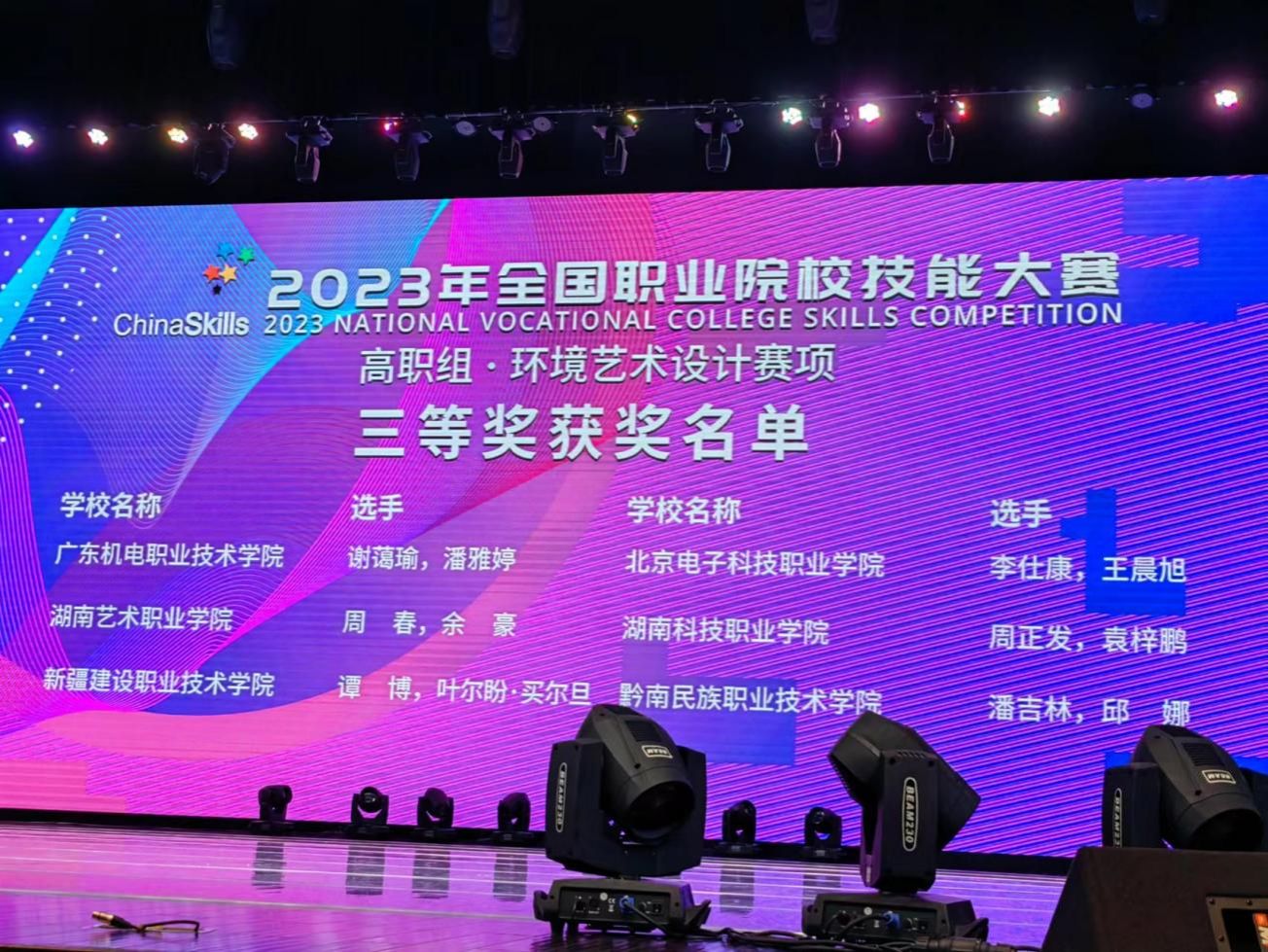7月22日至25日,2023年全国职业院校技能大赛“环境艺术设计”赛项总决赛在苏州工艺美术职业技术学院举行,来自全国64所职业学校的128名选手参加比赛。BEAT365艺术设计学院环境艺术专业学生王晨旭、李仕康荣获该赛项三等奖。