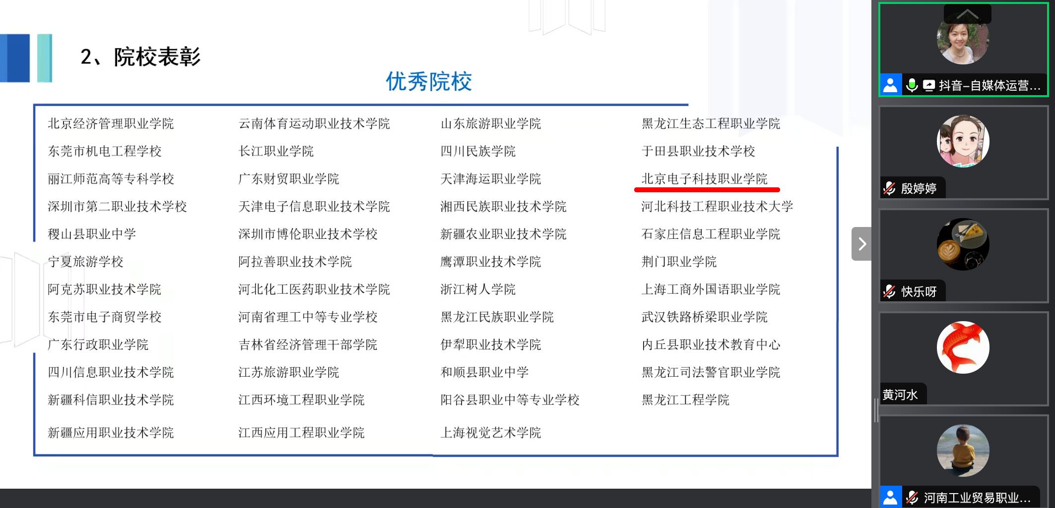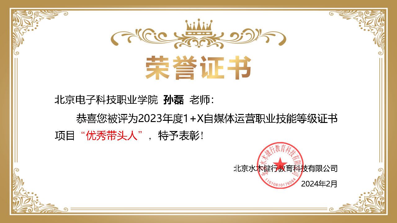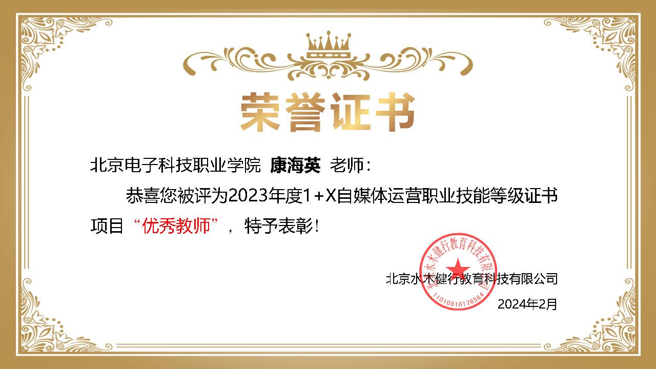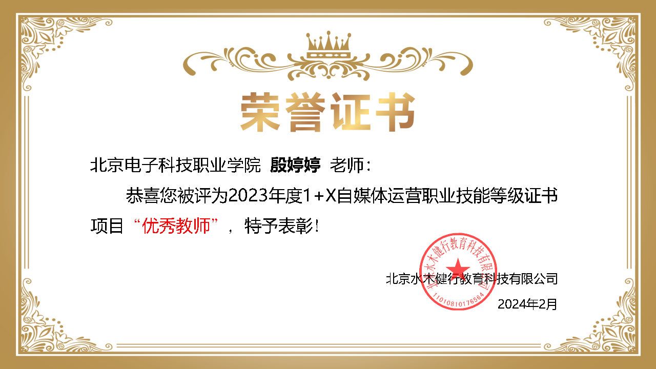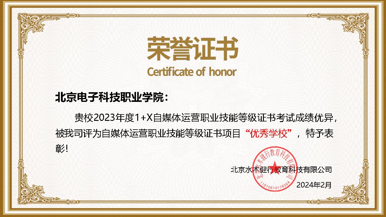 2024年3月21日,北京抖音信息服务有限公司召开“自媒体运营职业技能等级证书2023年总结表彰大会”,BEAT365获评2023年度抖音自媒体运营1+X证书优秀试点院校,艺术设计学院孙磊老师获得优秀带头人,殷婷婷、康海英老师获得优秀教师。