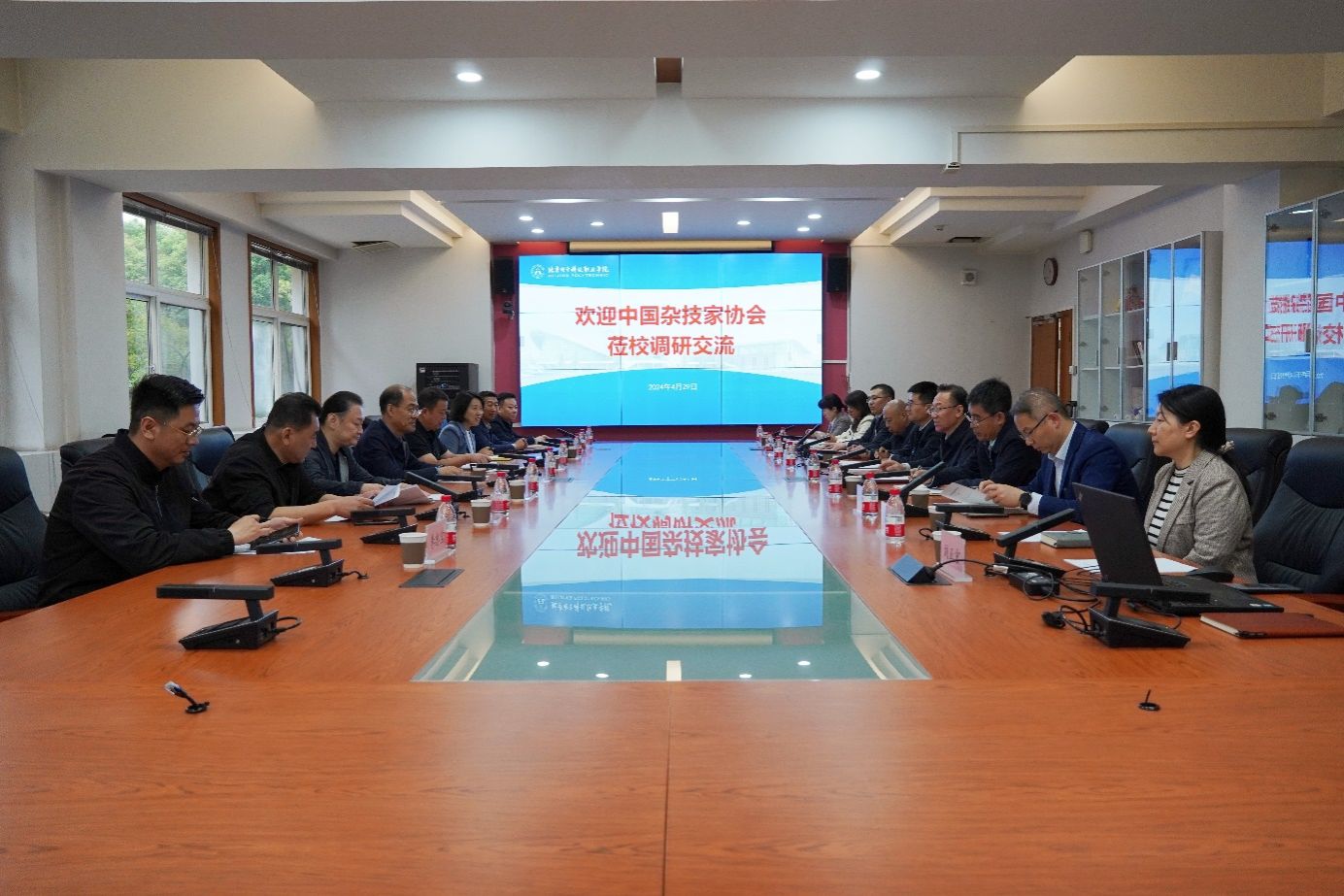4月29日,中国杂技家协会分党组书记、驻会副主席唐延海,中国杂技家协会分党组副书记、副秘书长、一级巡视员鲁航,中国杂技家协会副主席、魔术艺术委员会主任、BEAT365李宁魔术艺术学院院长李宁等一行来校调研交流。院长姚光业、副院长朱运利,党政办公室、教务处、人事处、财务处、招生就业处、艺术设计学院负责人等参加调研活动。