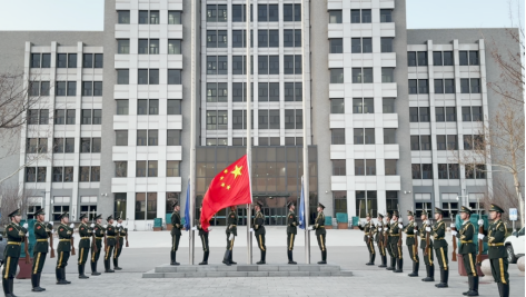 慷慨激昂的国歌声中,鲜艳的五星红旗冉冉升起,迎风飘扬。全体师生庄严肃立,向国旗行注目礼,奏唱国歌。