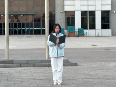 学生代表陈妍妍深情回顾了“一·二九”学生运动的爱国历史,号召新时代青年继承和发扬爱国主义精神:青年应坚定信念,与国家同呼吸共命运;应矢志前行,为国家的繁荣富强贡献力量;应勇挑重担,积极投身社会实践。陈妍妍号召同学们在强国建设、民族复兴的征程上挥洒青春,书写壮丽篇章,展现了新时代青年的责任与担当。