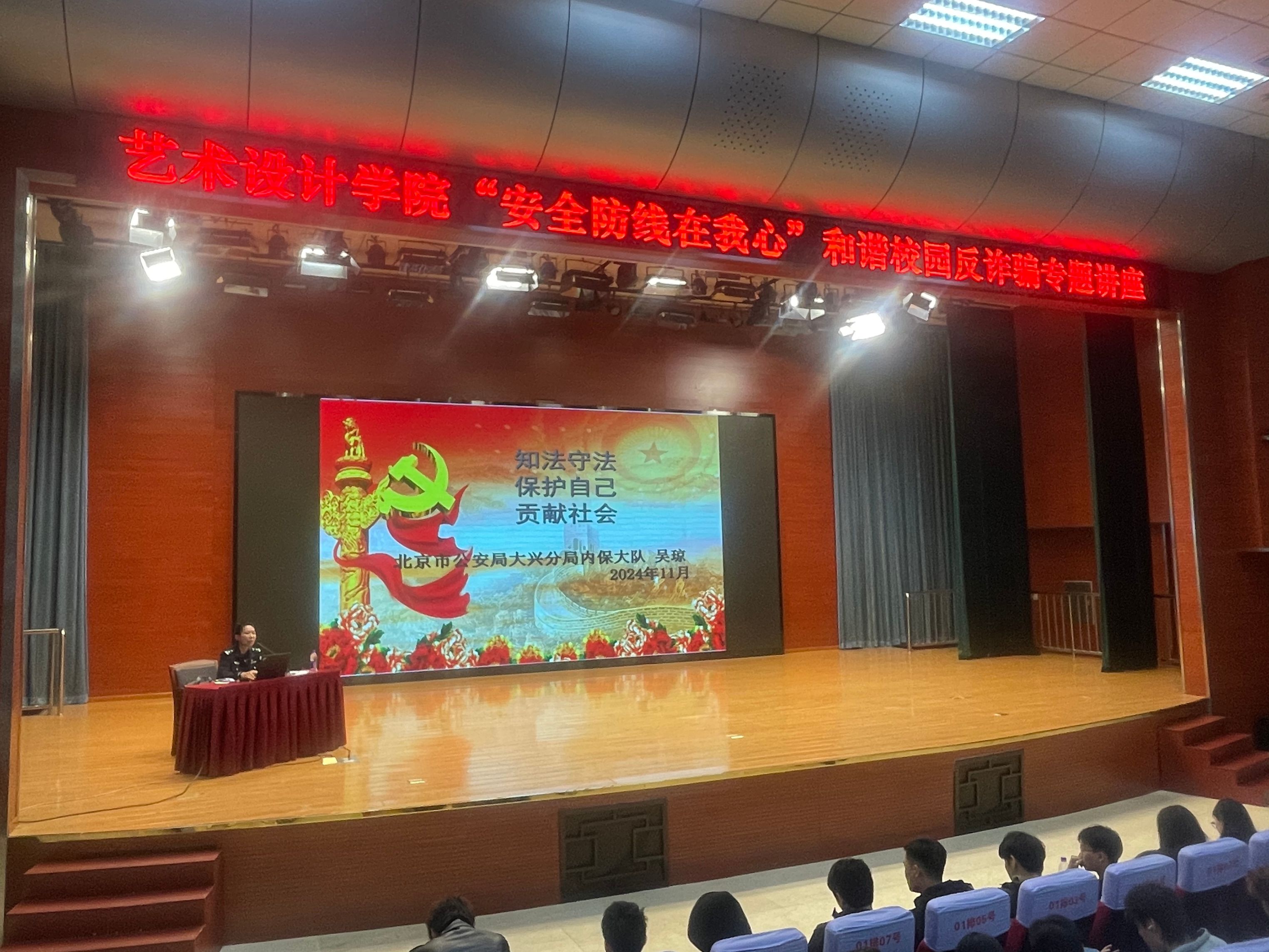 11月18日,艺术设计学院在图书馆报告厅开展了“安全教育在我心,和谐校园反诈骗”专题培训,特邀大兴公安分局内保大队副中队长吴琼作为主讲嘉宾。吴琼队长凭借丰富的实战经验和专业知识,围绕校园纠纷和防范诈骗两大主题进行了深入浅出的讲解。他通过生动的案例分析和实用的防范技巧,引导学生们认识到诈骗行为的多样性和危害性,进一步提升了大家的防诈意识和反诈能力。此次讲座吸引了300余名师生前来参加,现场座无虚席,气氛热烈。