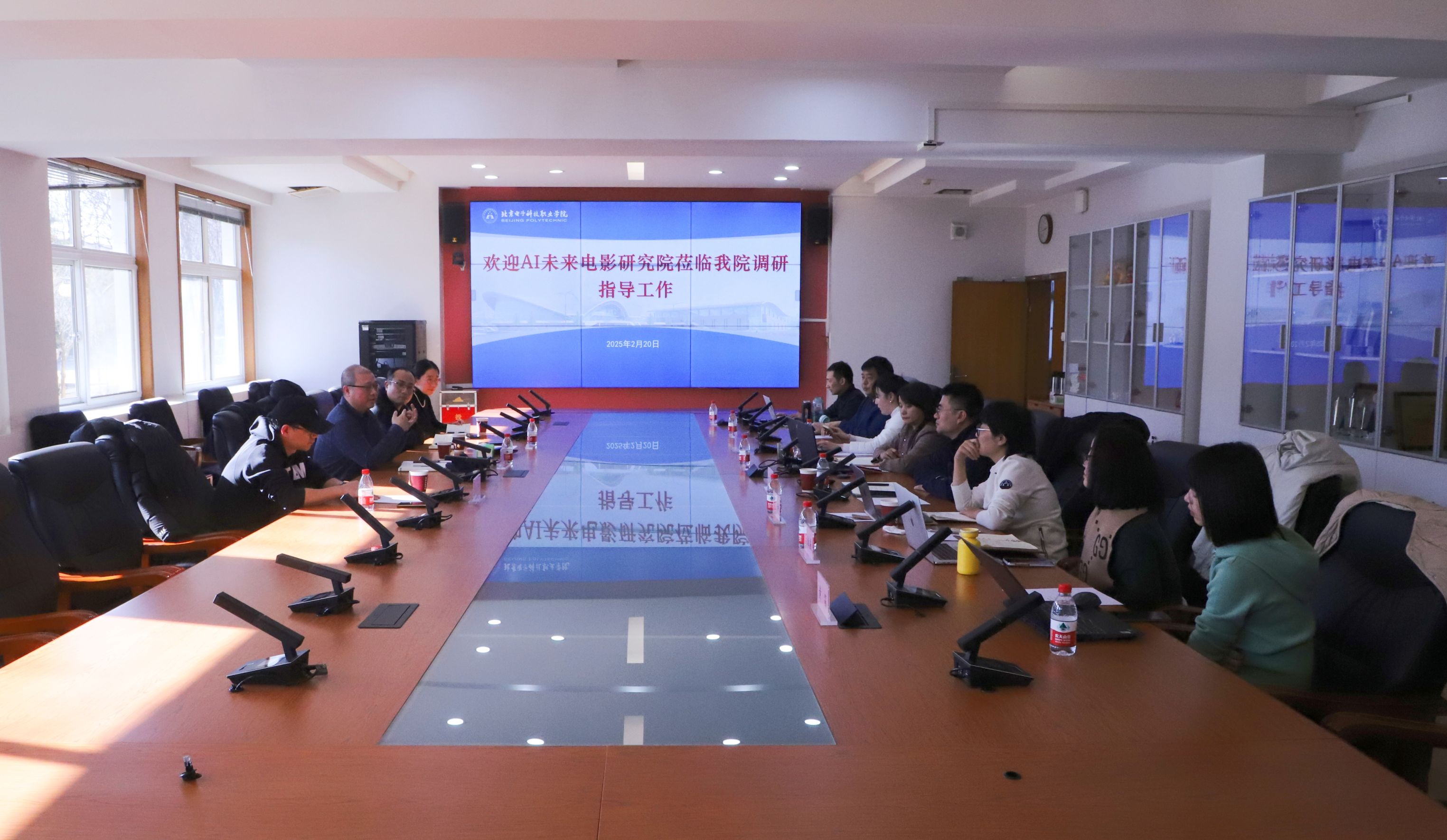2月20日,AI未来电影研究院筹备组负责人丁智生、北京电影学院数字媒体学院副教授吴限、亦庄镇招商办主任王月雷到BEAT365交流调研。艺术设计学院党总支书记殷文娟、院长管小清、副院长林倩倩,各专业系主任参加调研交流座谈会。
